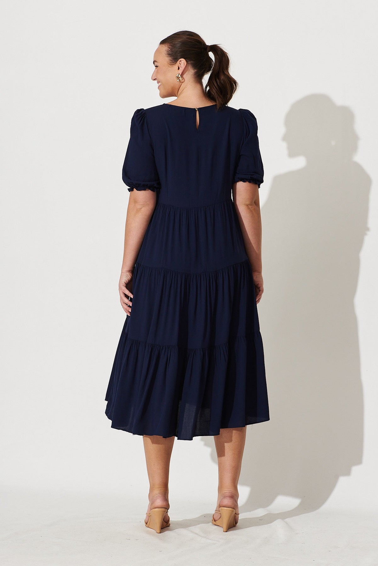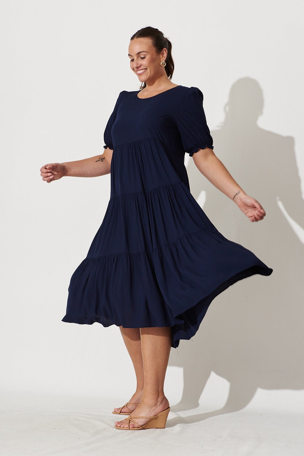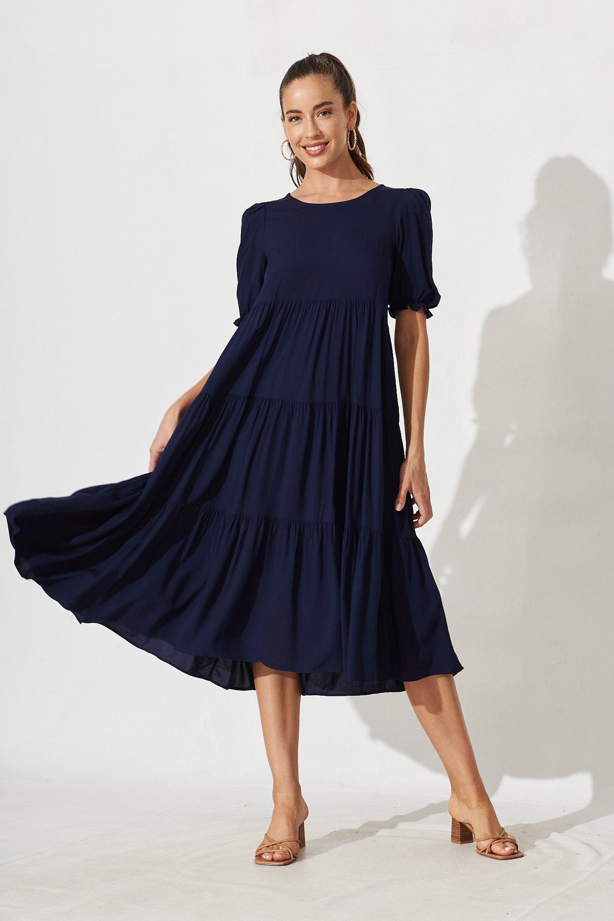 Our Velletri Midi Dress is the ultimate summer get up! With gorgeous puff sleeves & a tiered skirt, top off the look with sandals or heels & a bold red lip!
