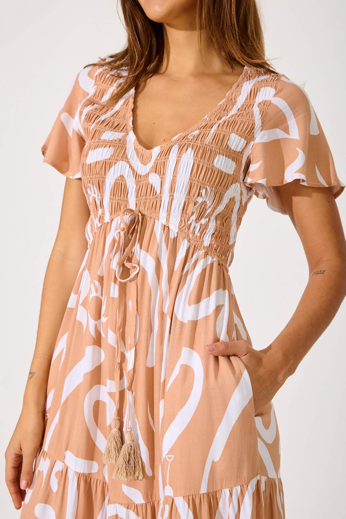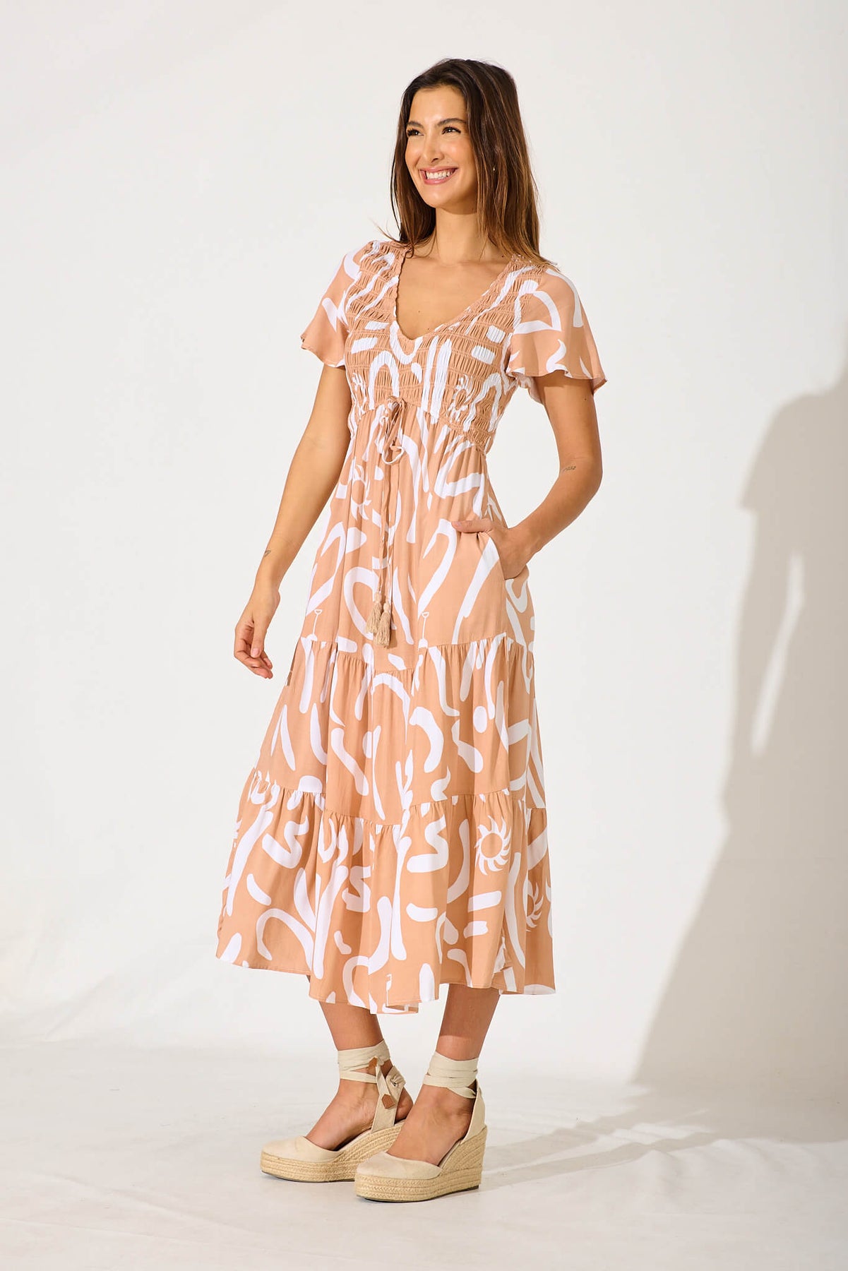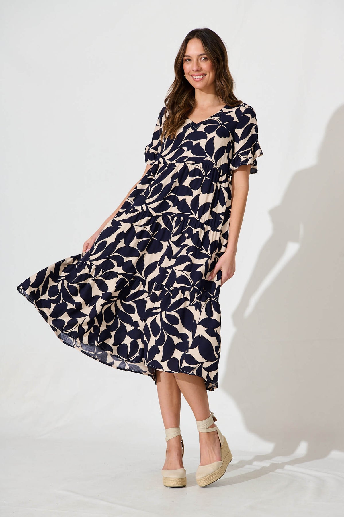 PRE ORDER Kristen Midi Smock Dress In Beige With Navy Floral