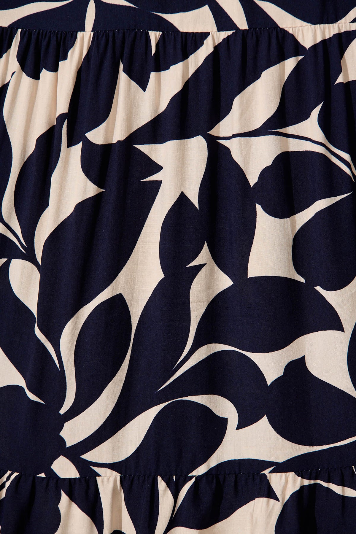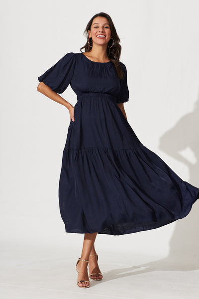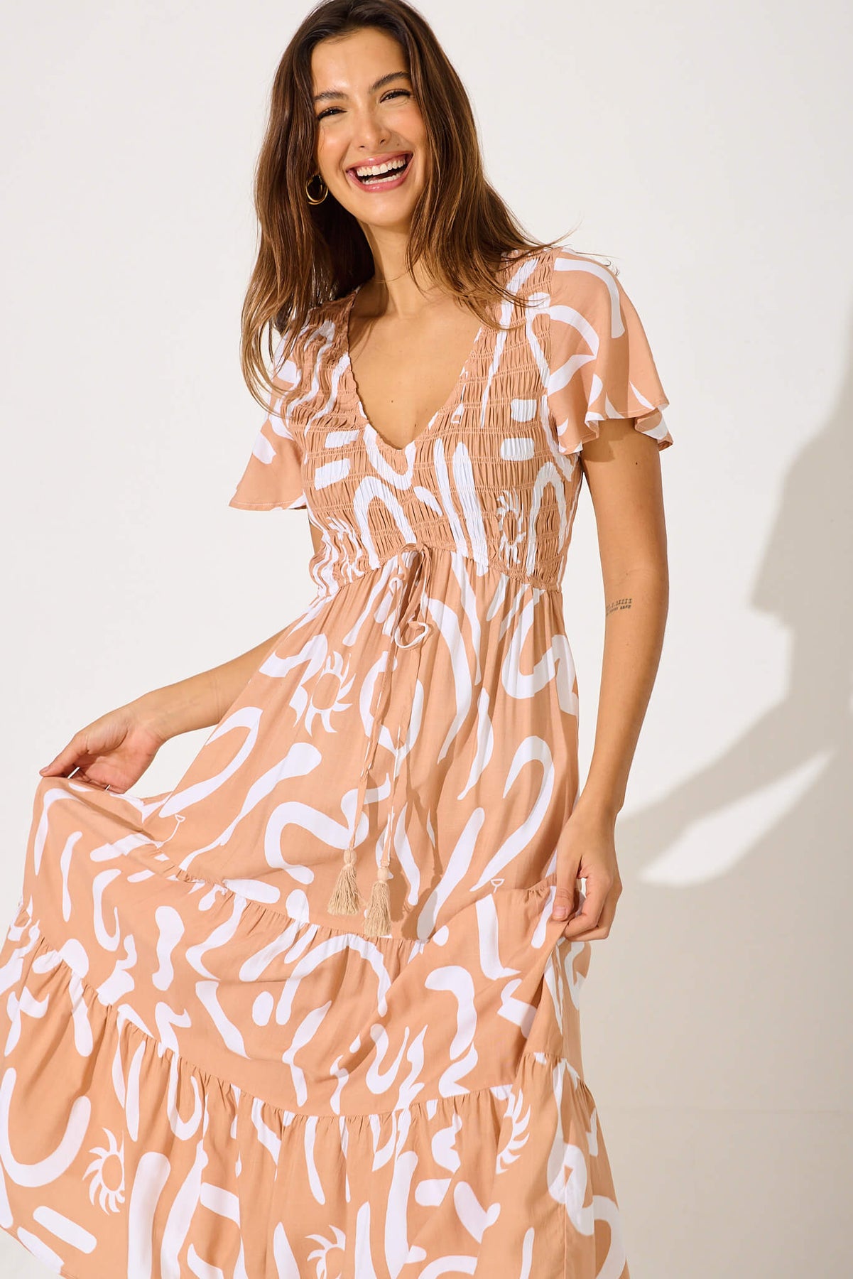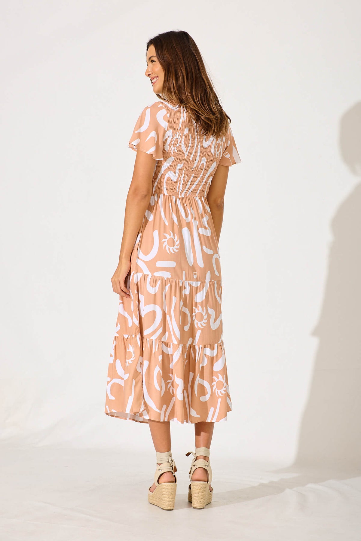 PRE ORDER Kristen Midi Smock Dress In Beige With Navy Floral