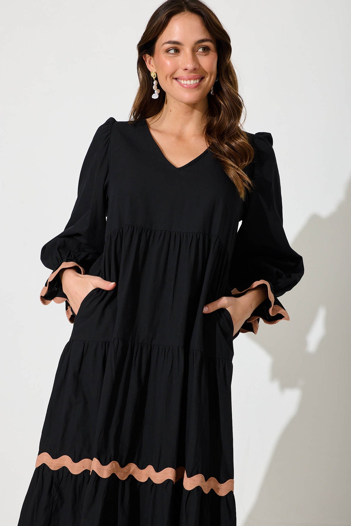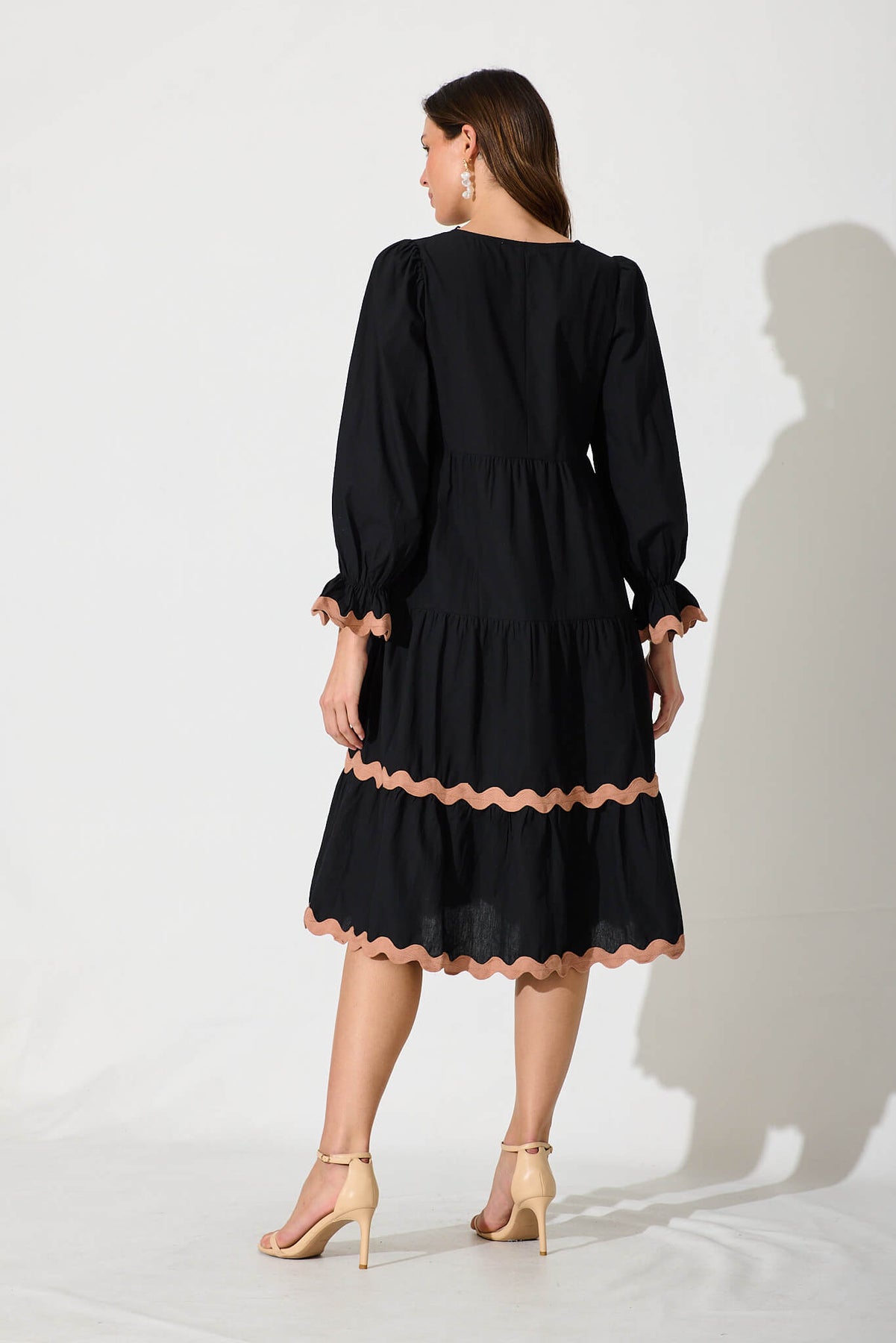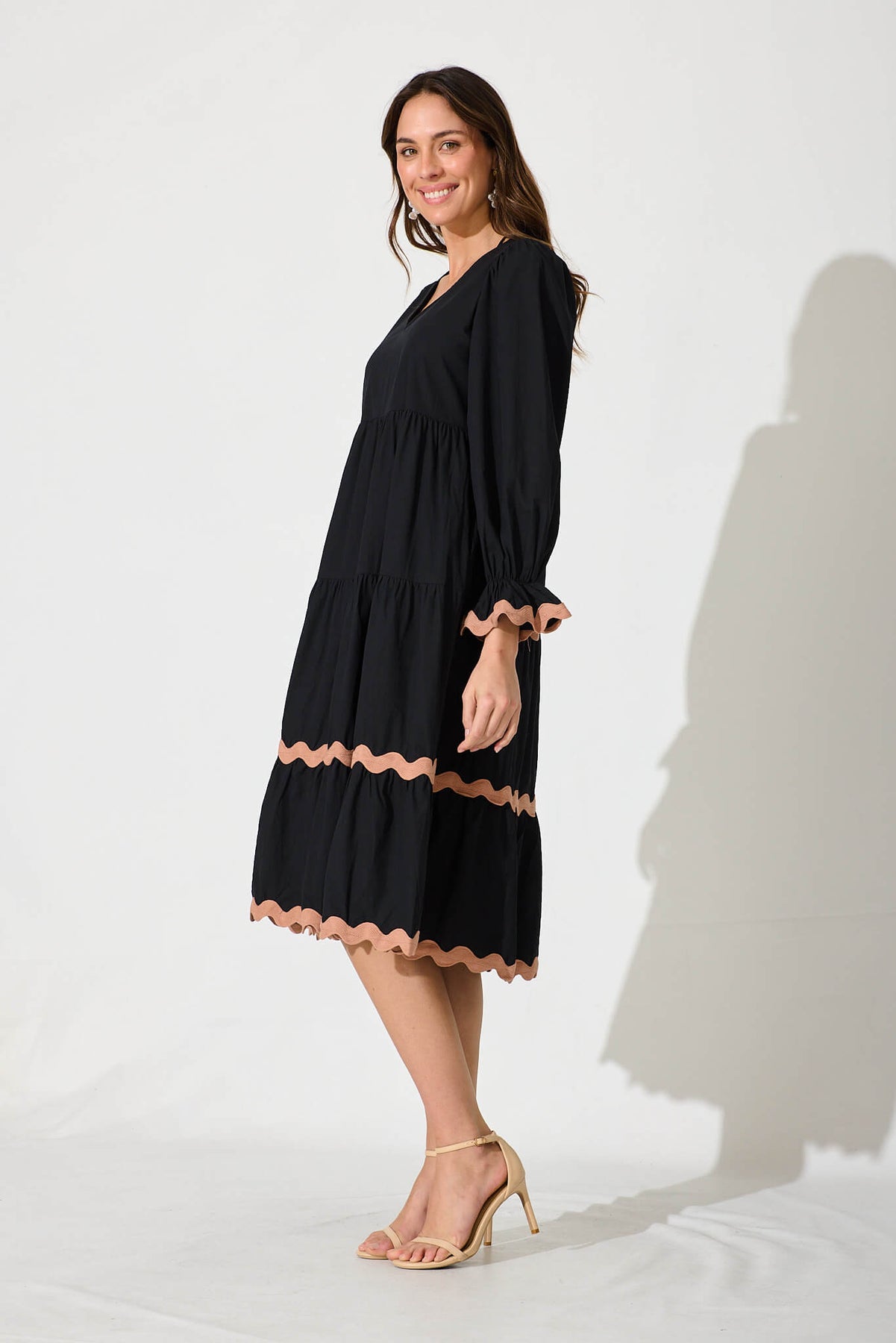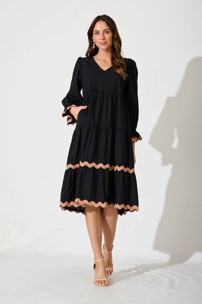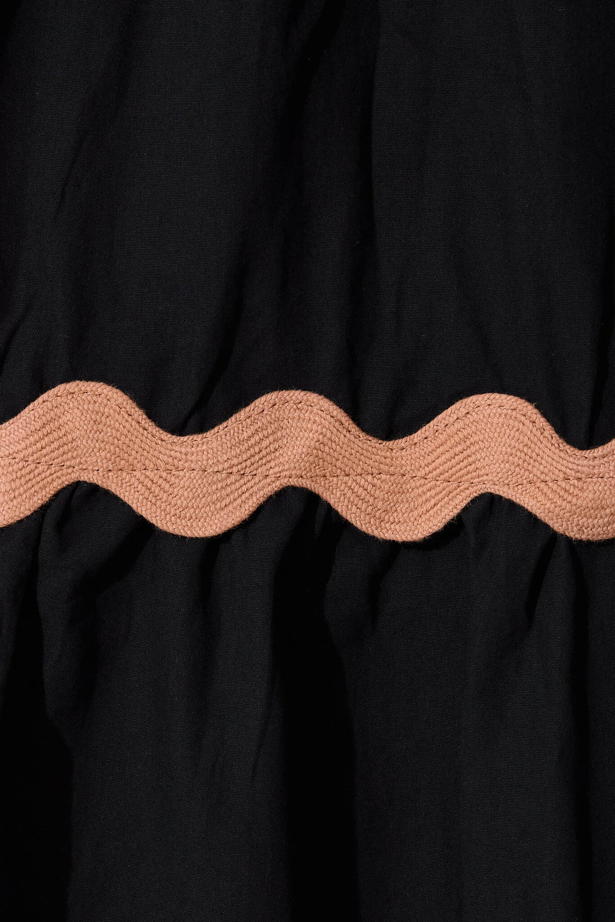 Ramona Midi Smock Dress In Black Cotton With Ric Rac Trim