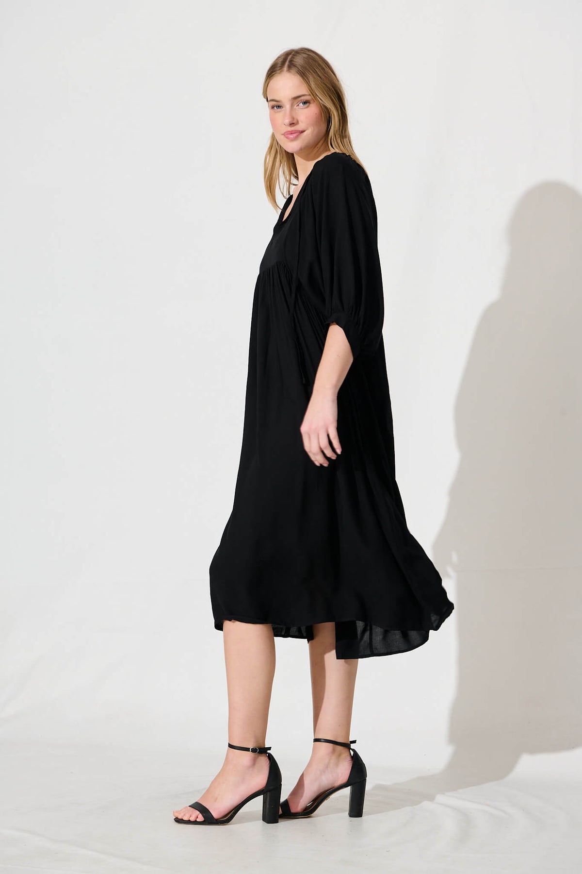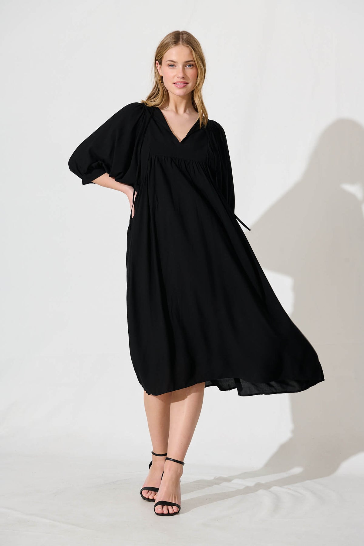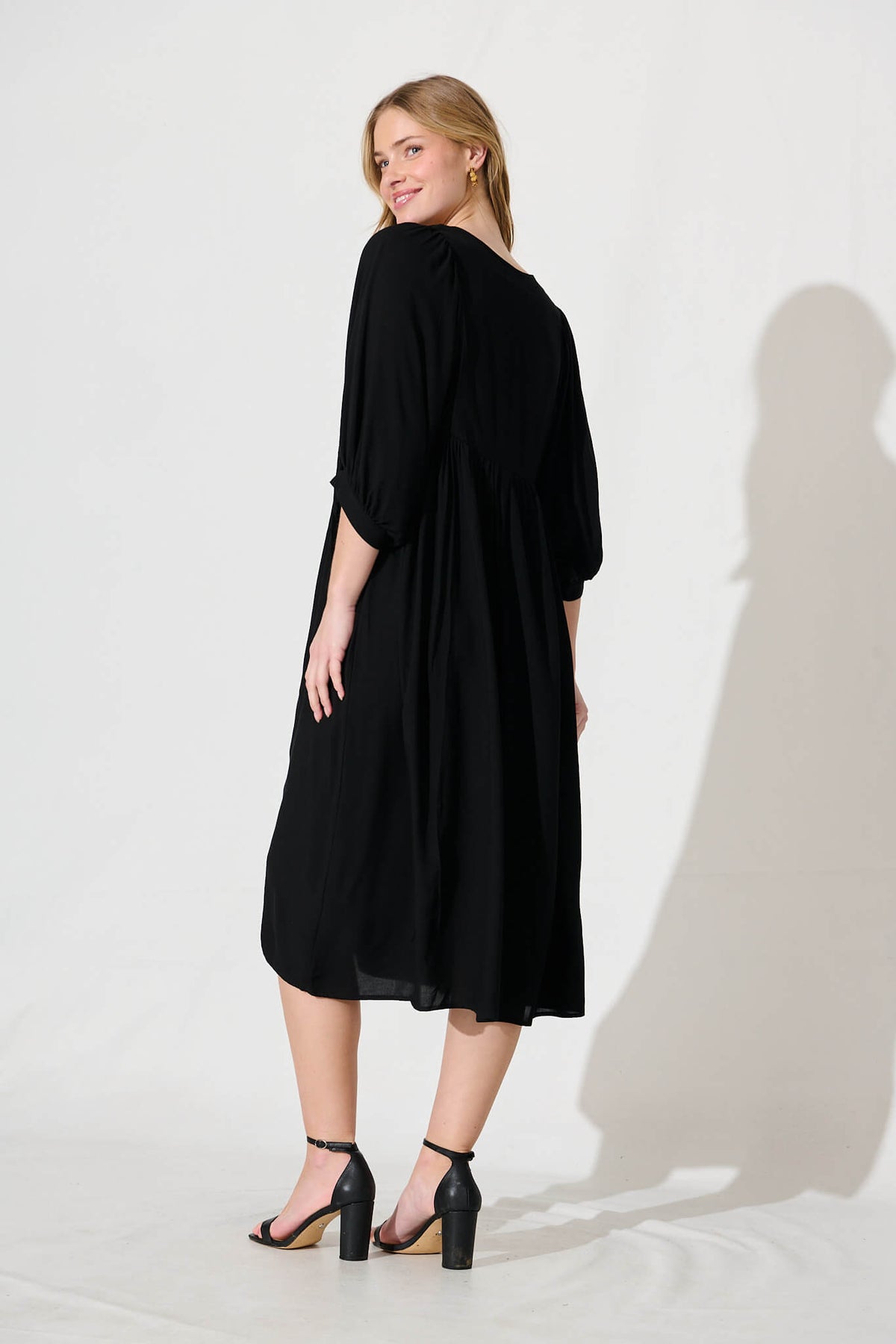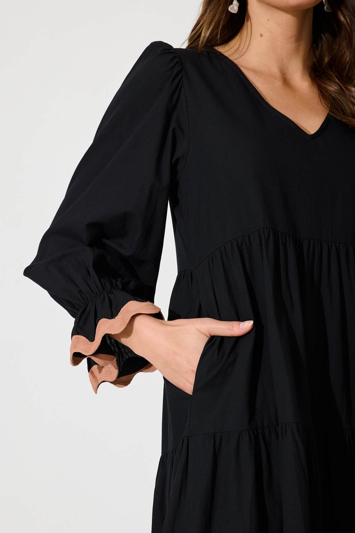 Ramona Midi Smock Dress In Black Cotton With Ric Rac Trim