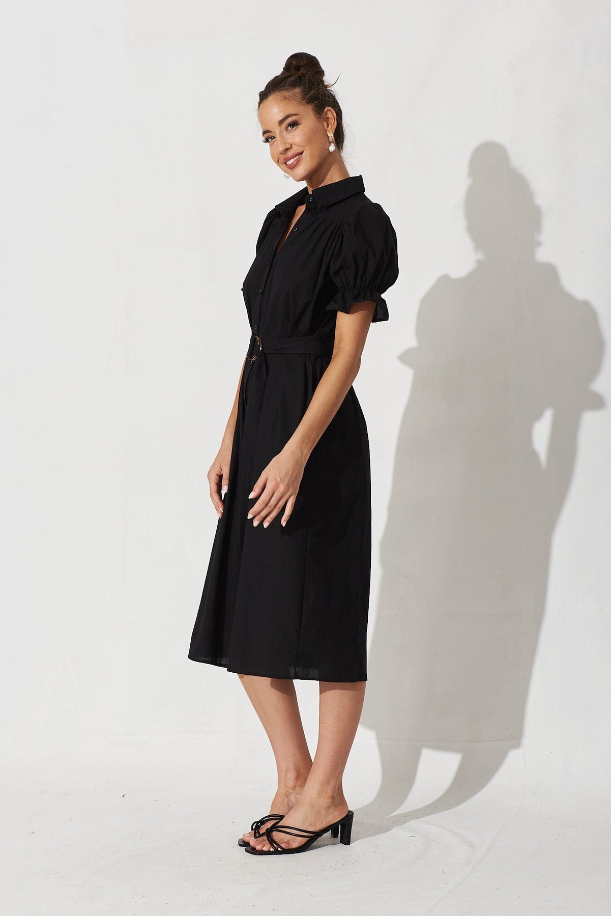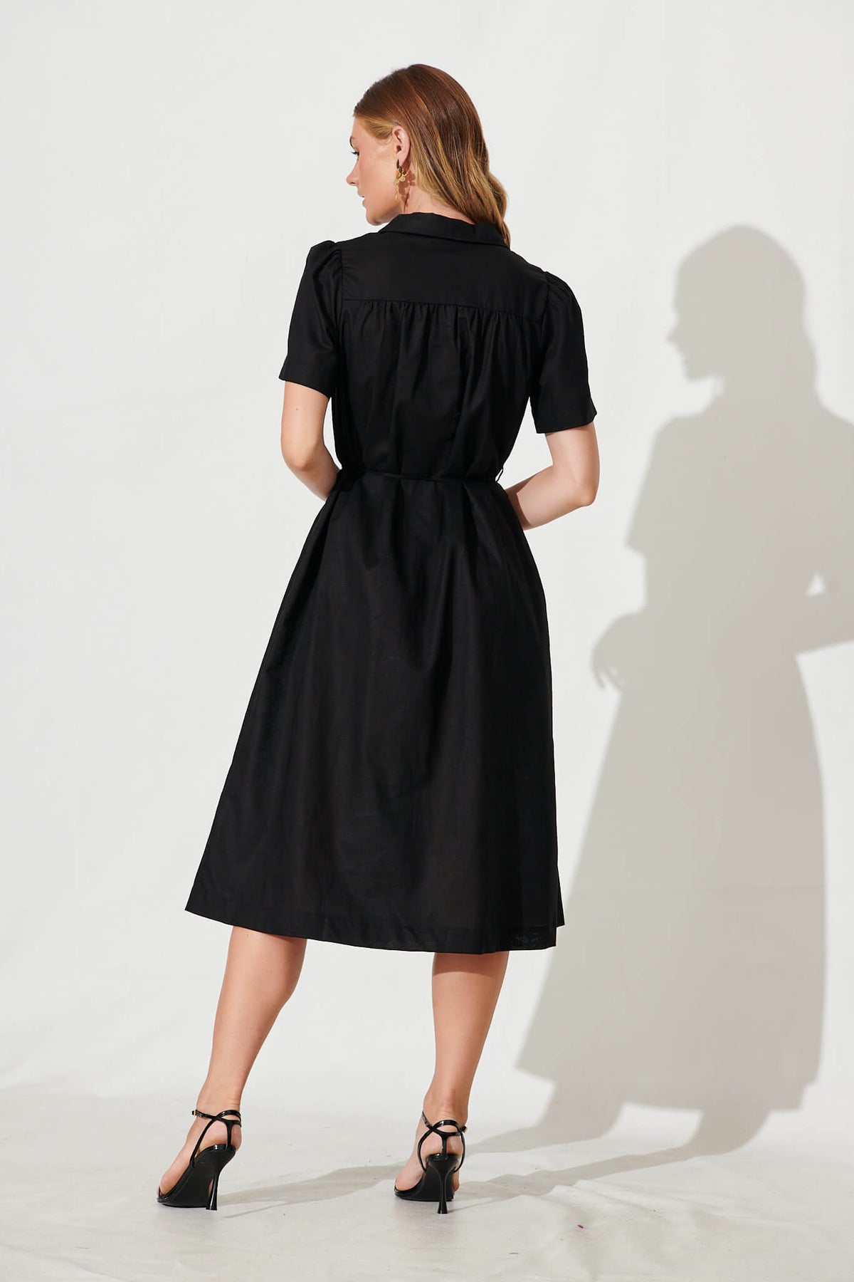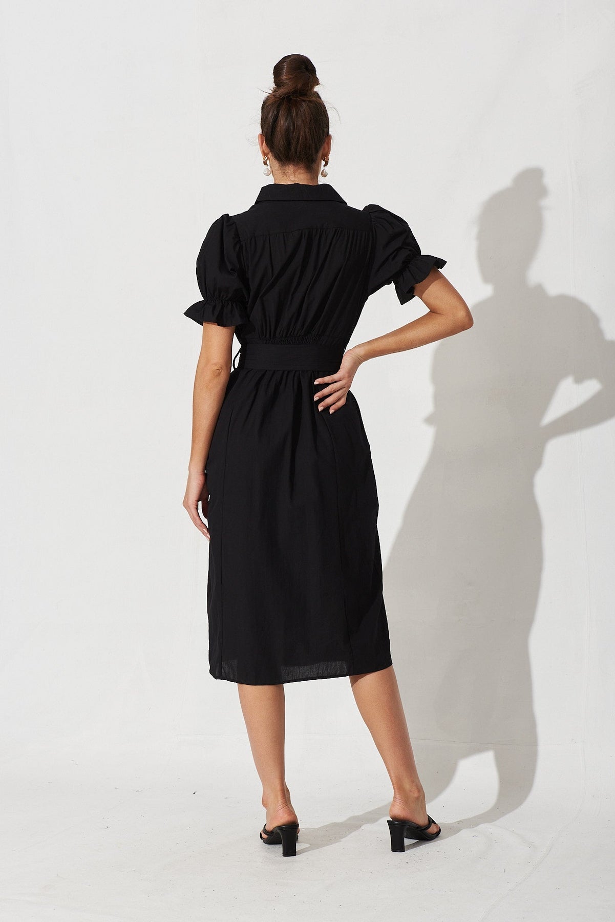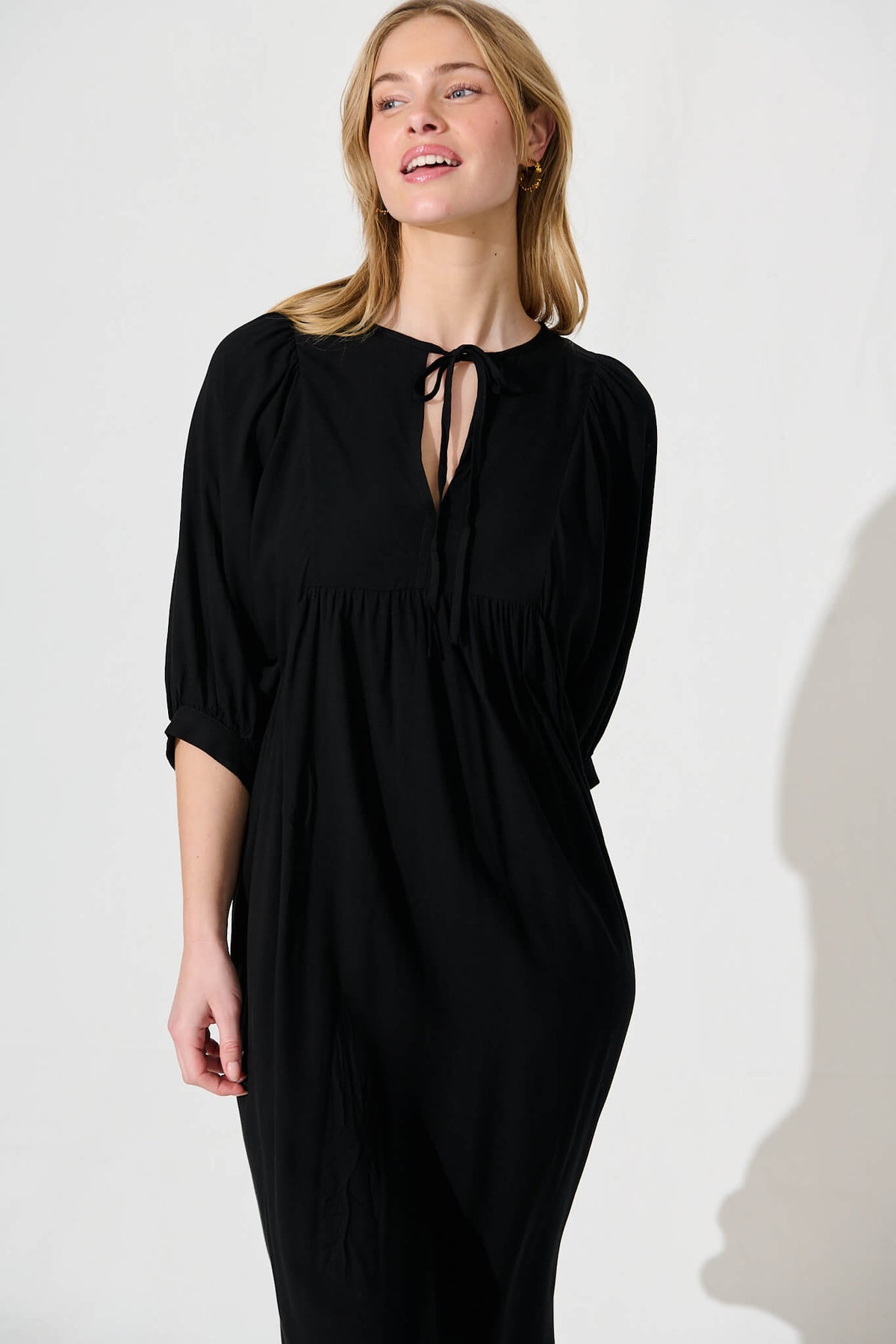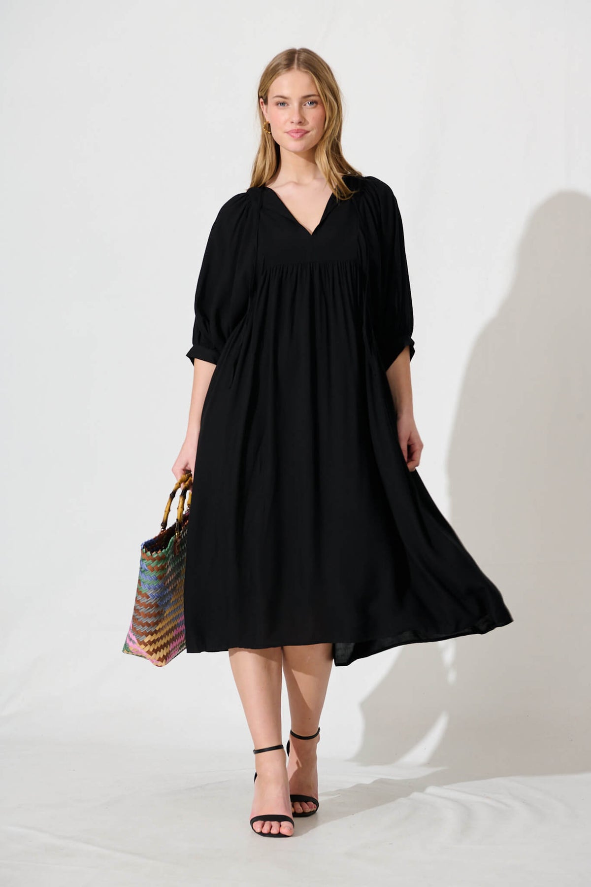 Ramona Midi Smock Dress In Black Cotton With Ric Rac Trim