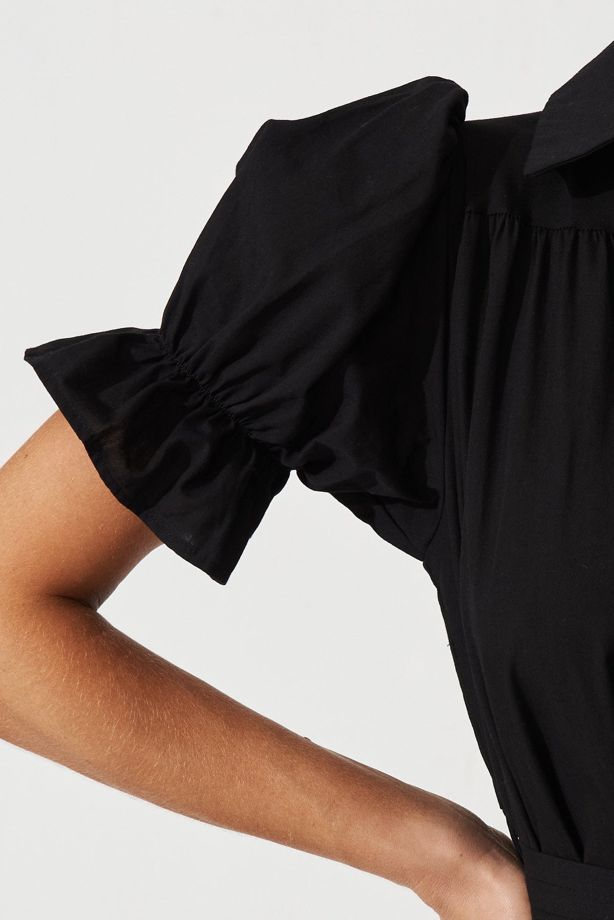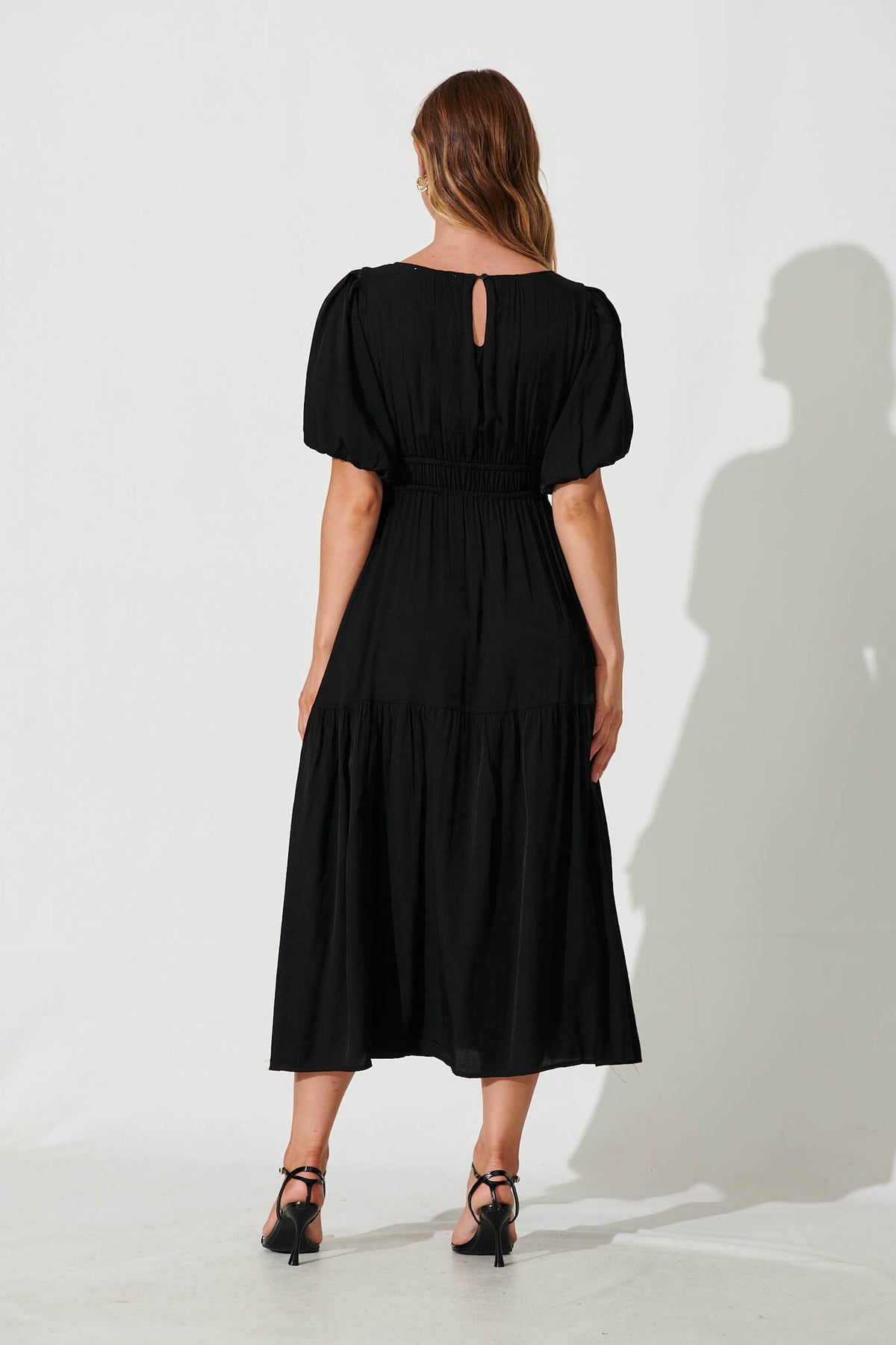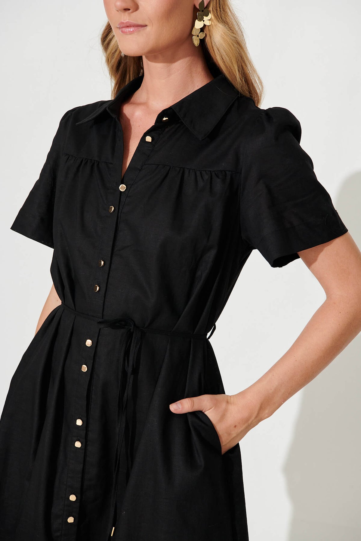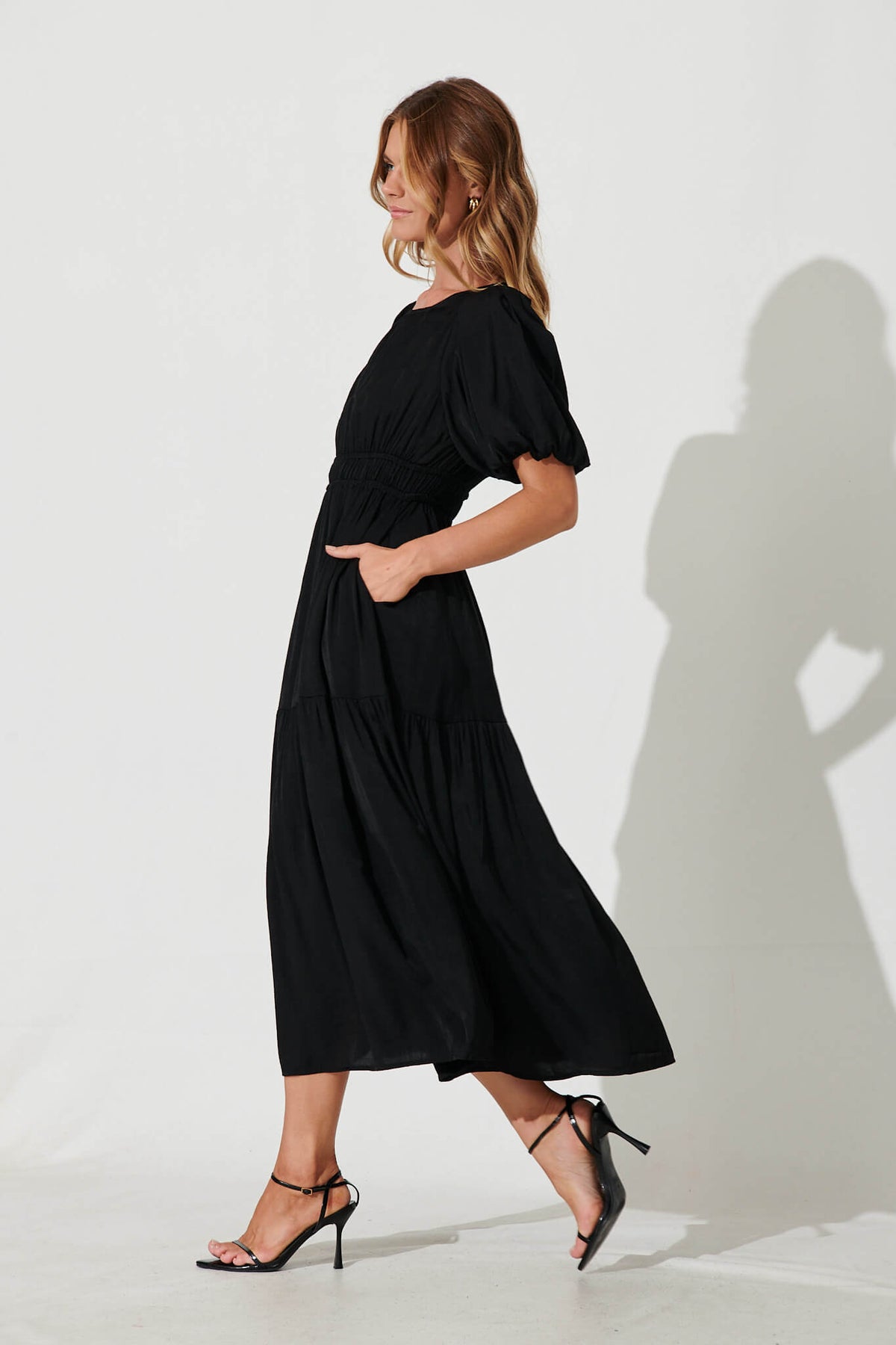 Ramona Midi Smock Dress In Black Cotton With Ric Rac Trim