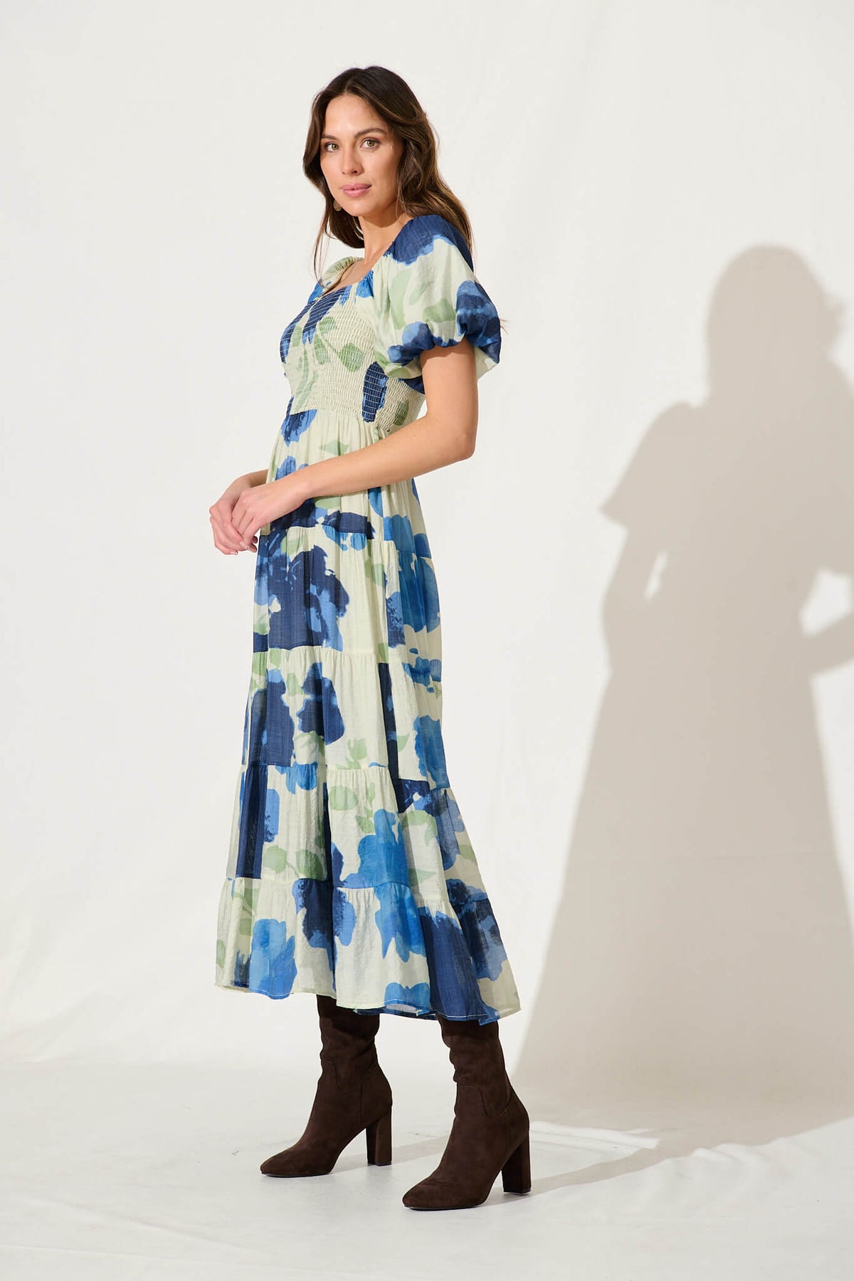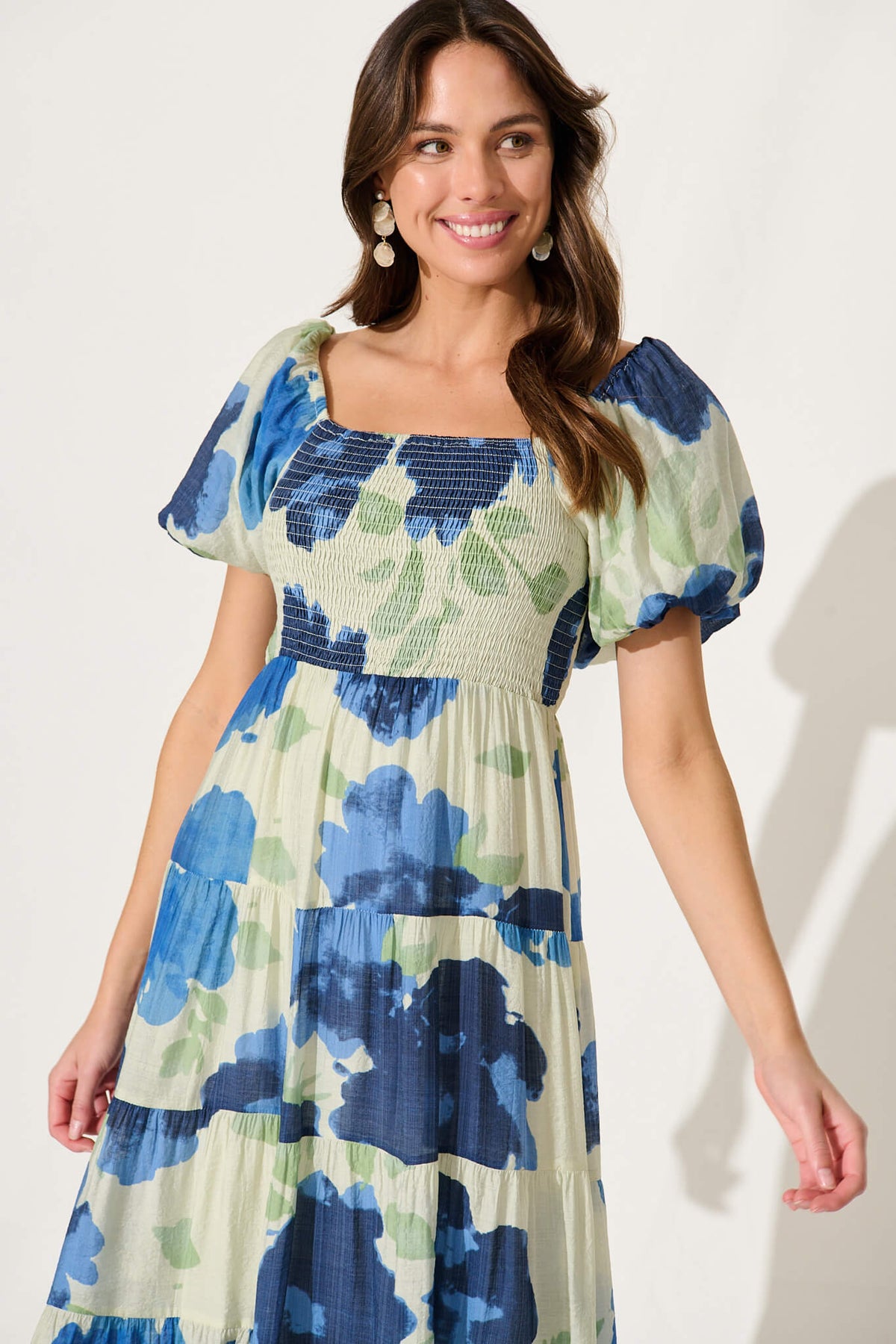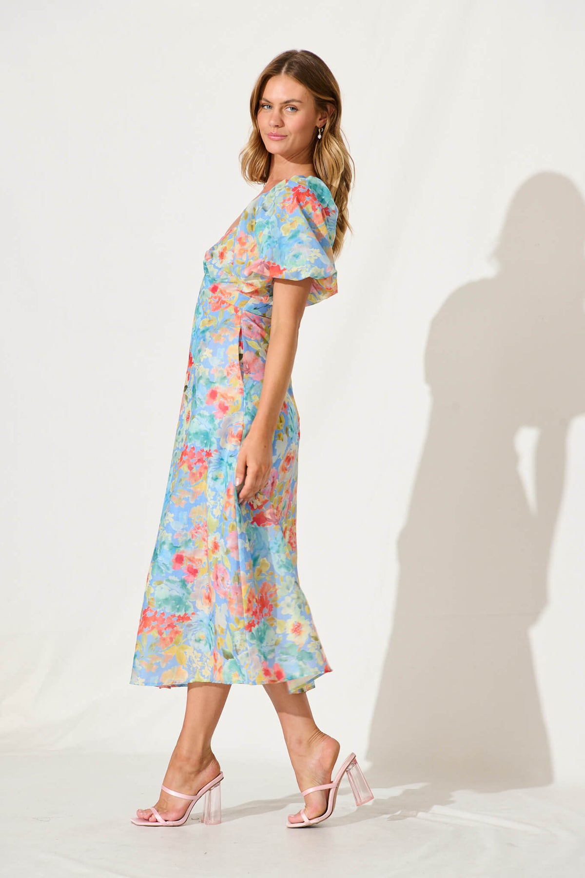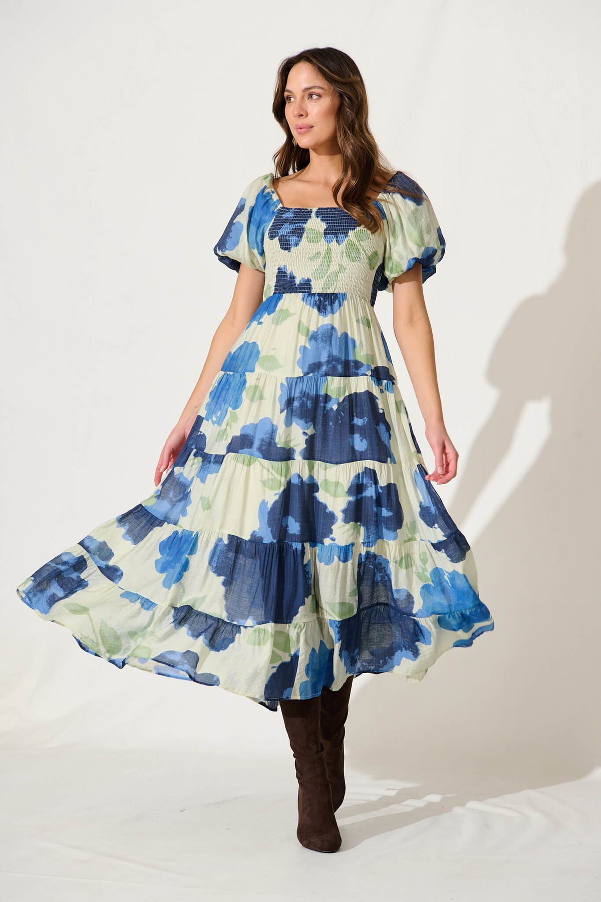 Vale Midi Dress In Blue With Multi Floral Cotton Blend
