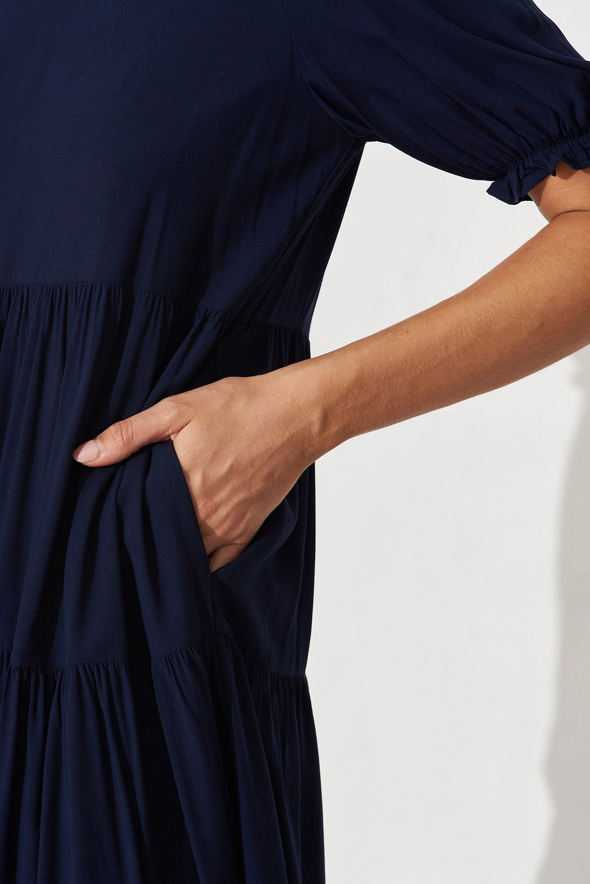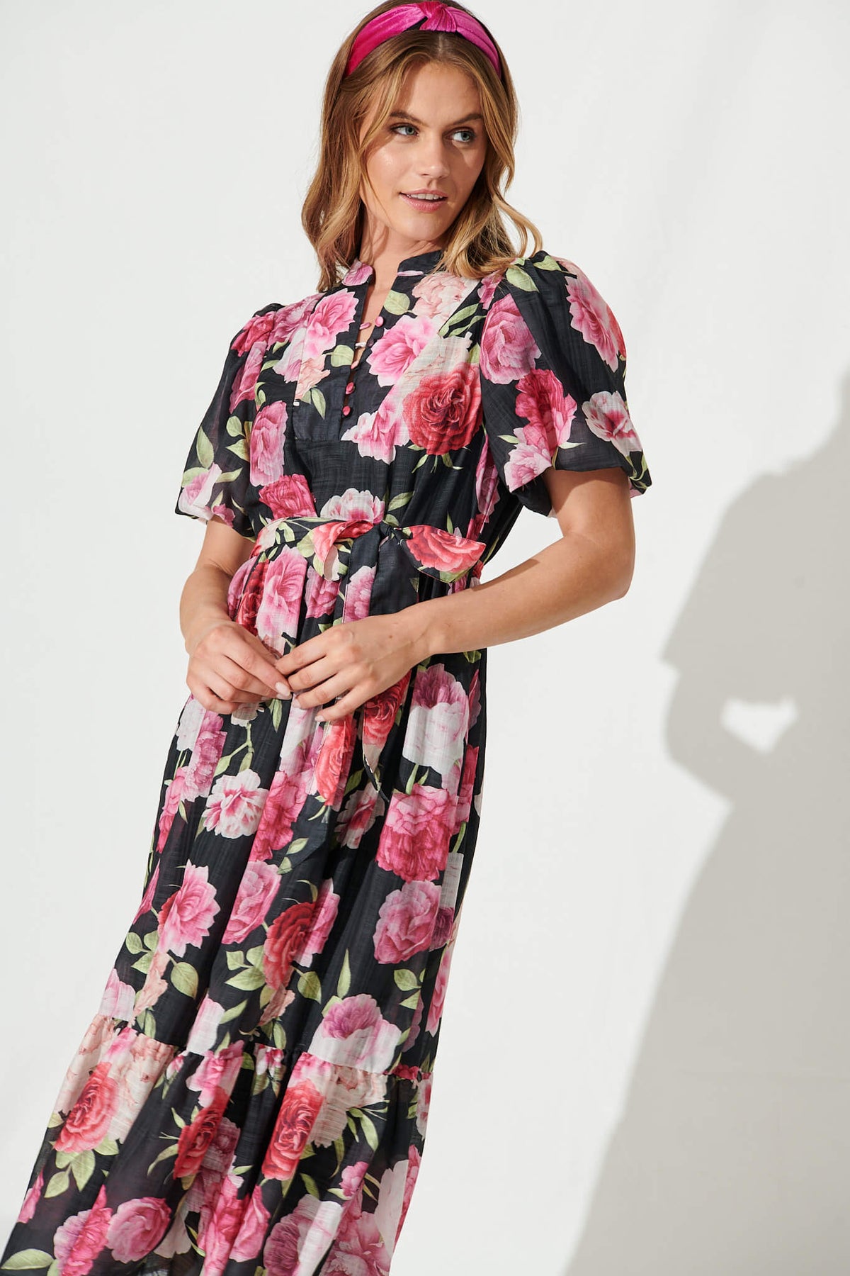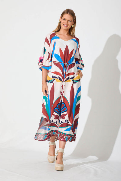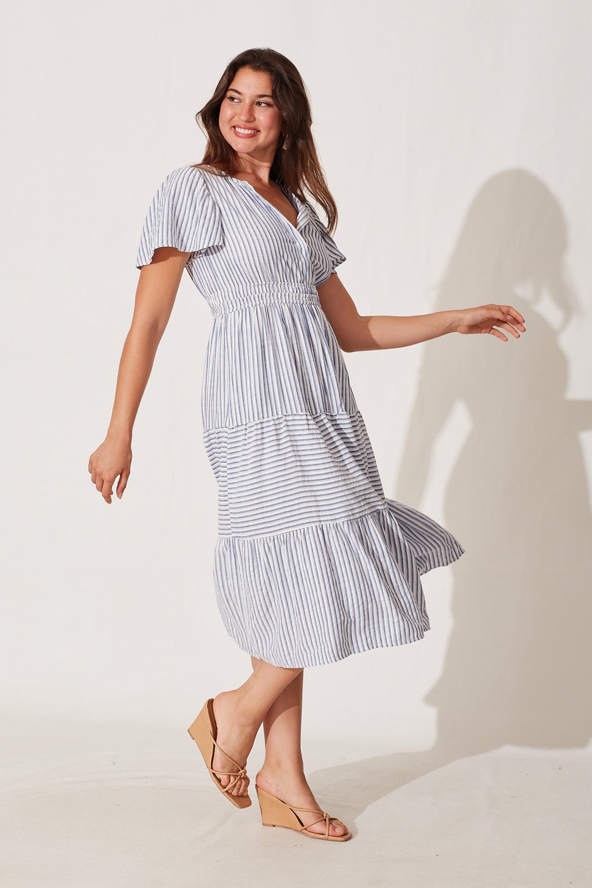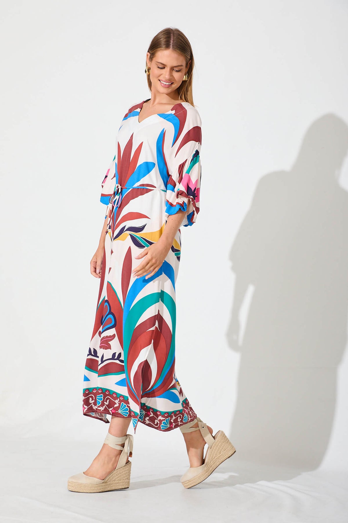 Vale Midi Dress In Blue With Multi Floral Cotton Blend