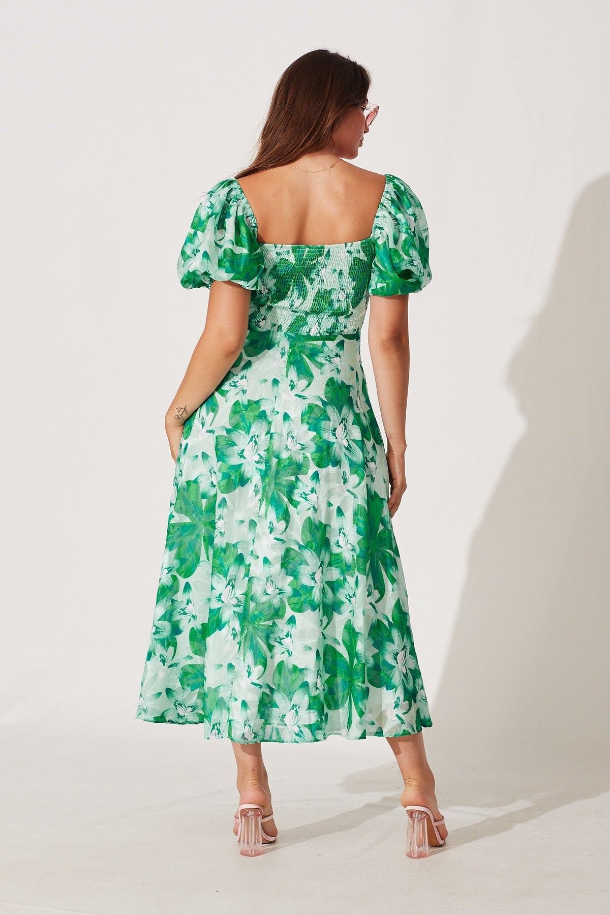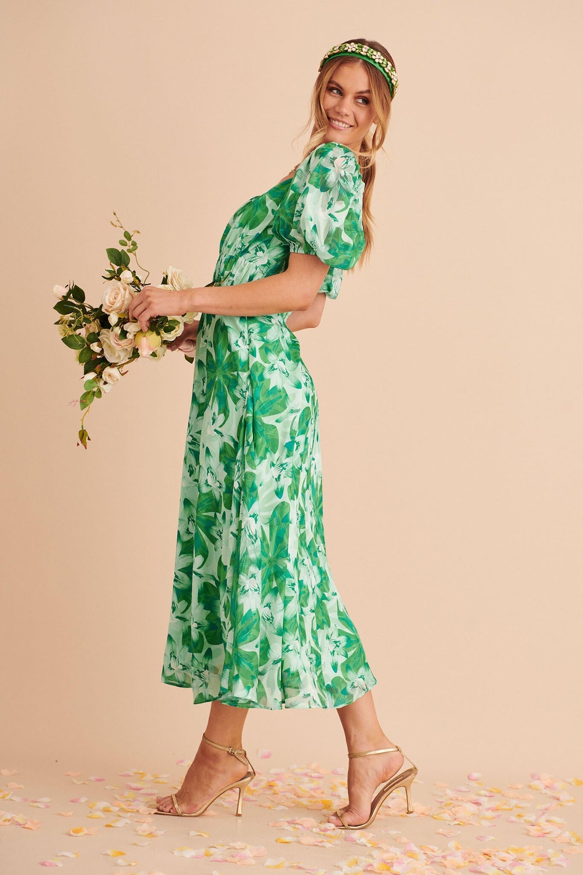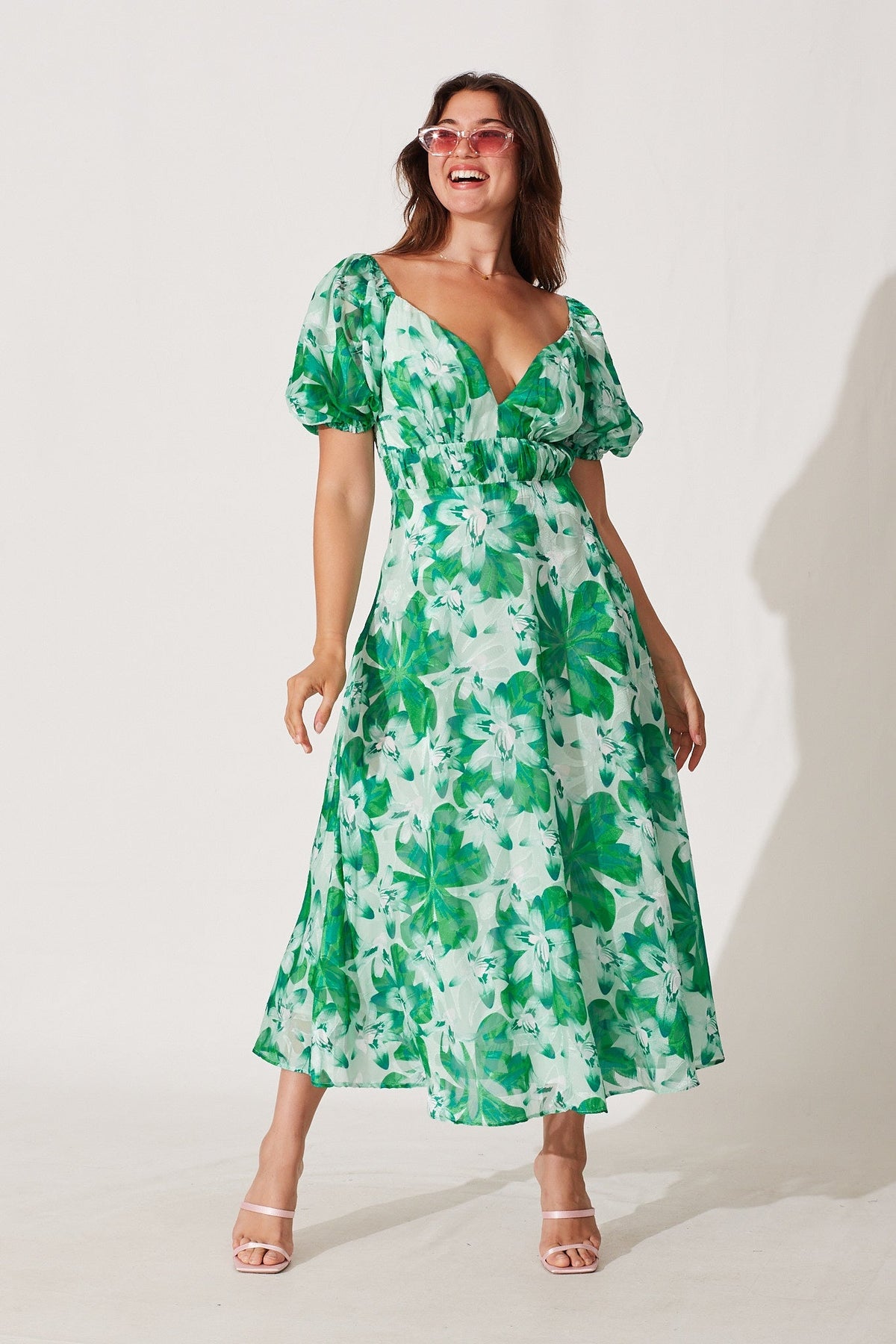 Whitley Midi Dress In Green Floral Burnout Chiffon