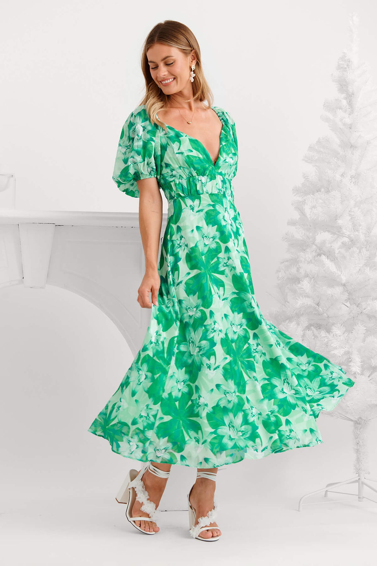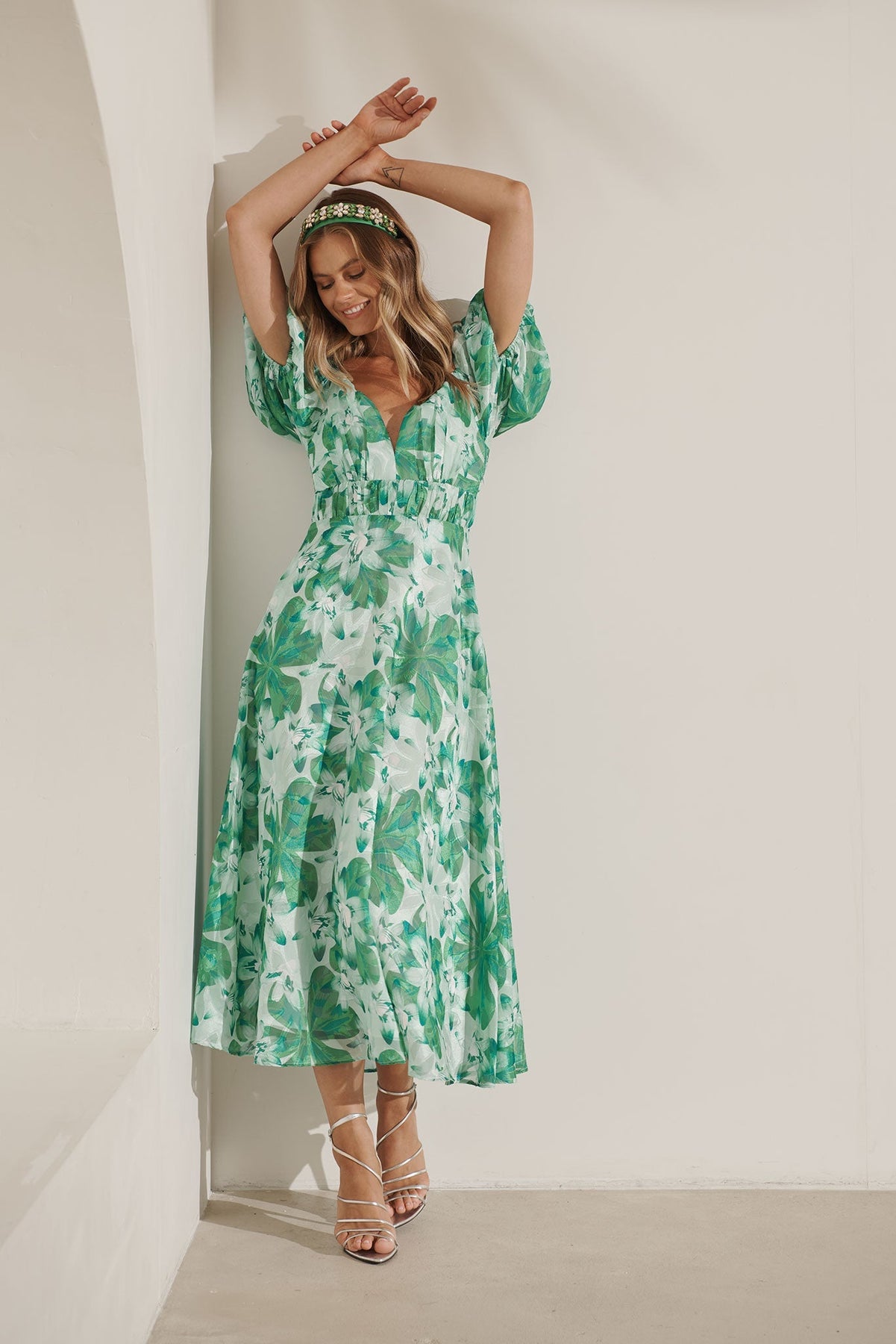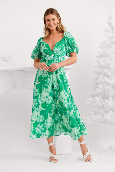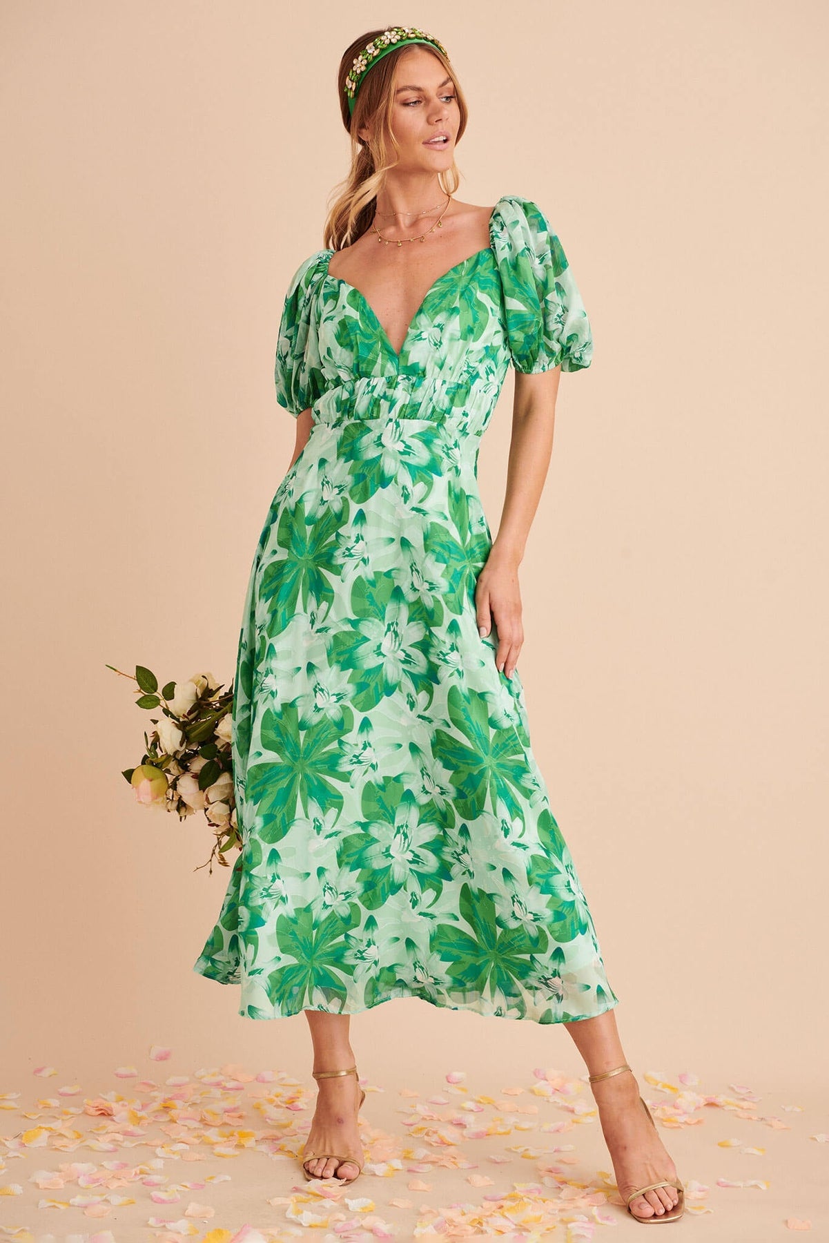 Whitley Midi Dress In Green Floral Burnout Chiffon