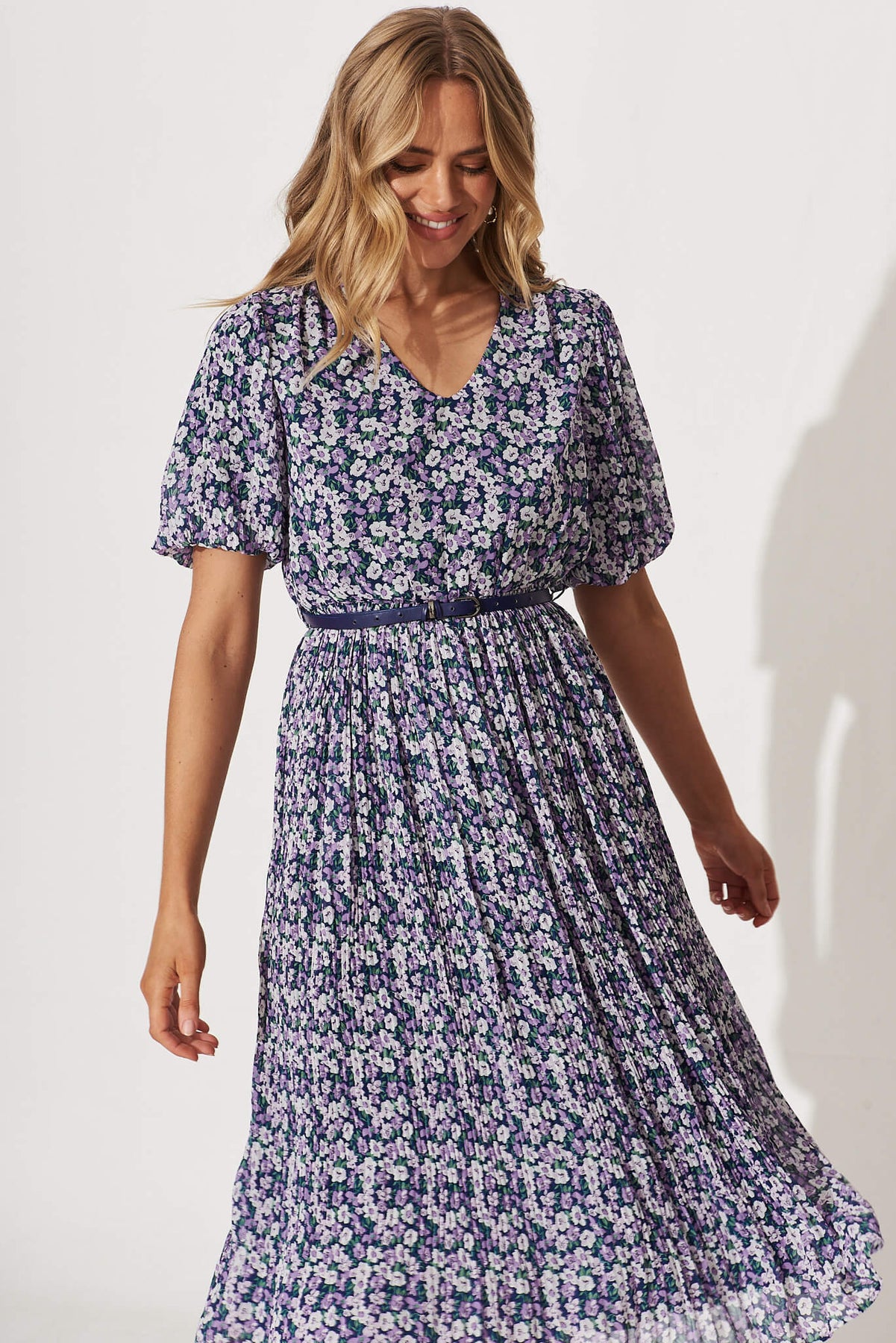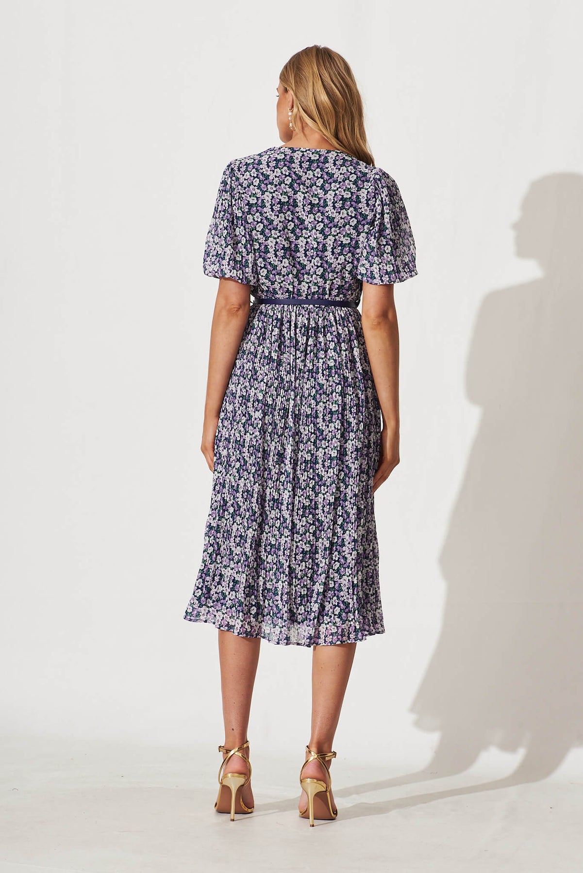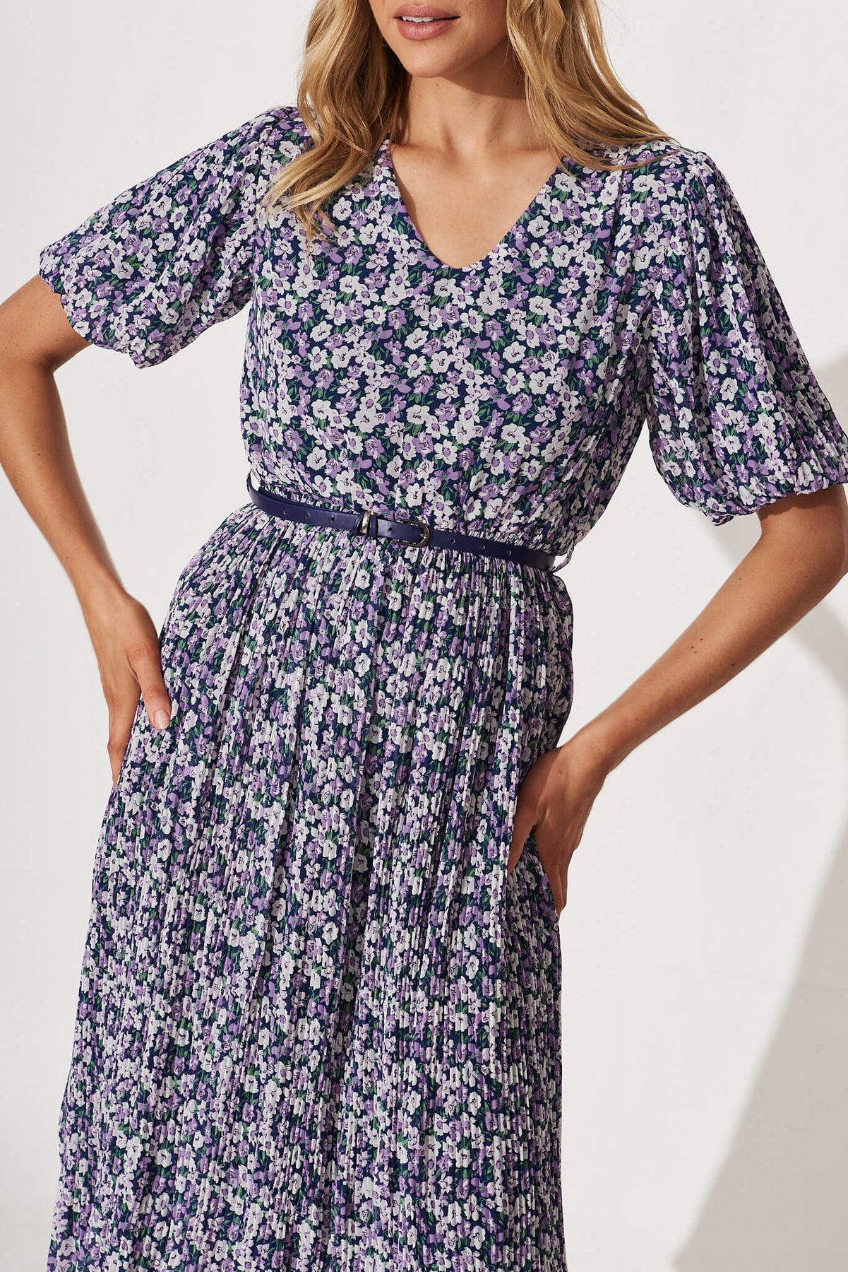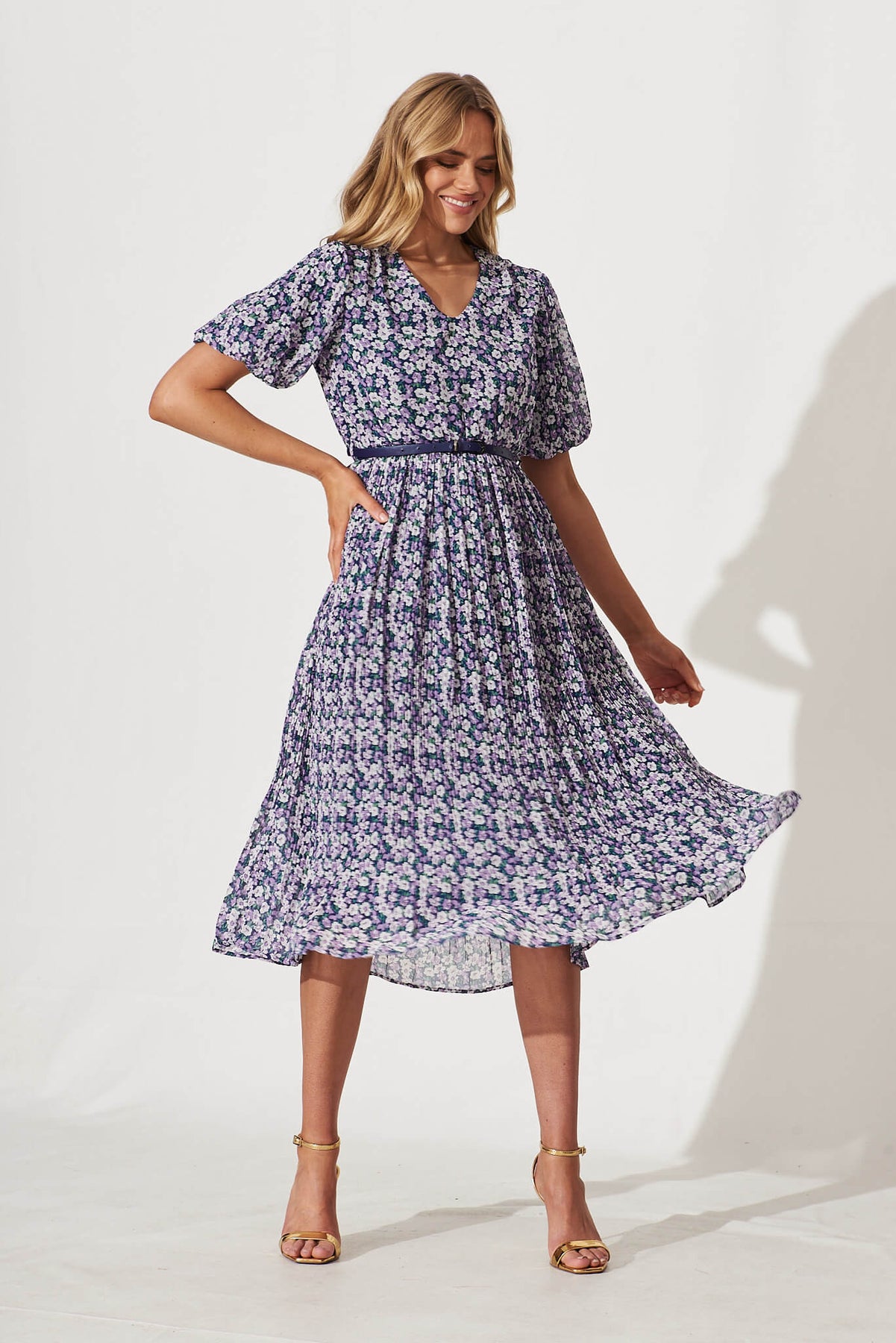 Rosalina Midi Dress With Belt In Multi Blue Floral