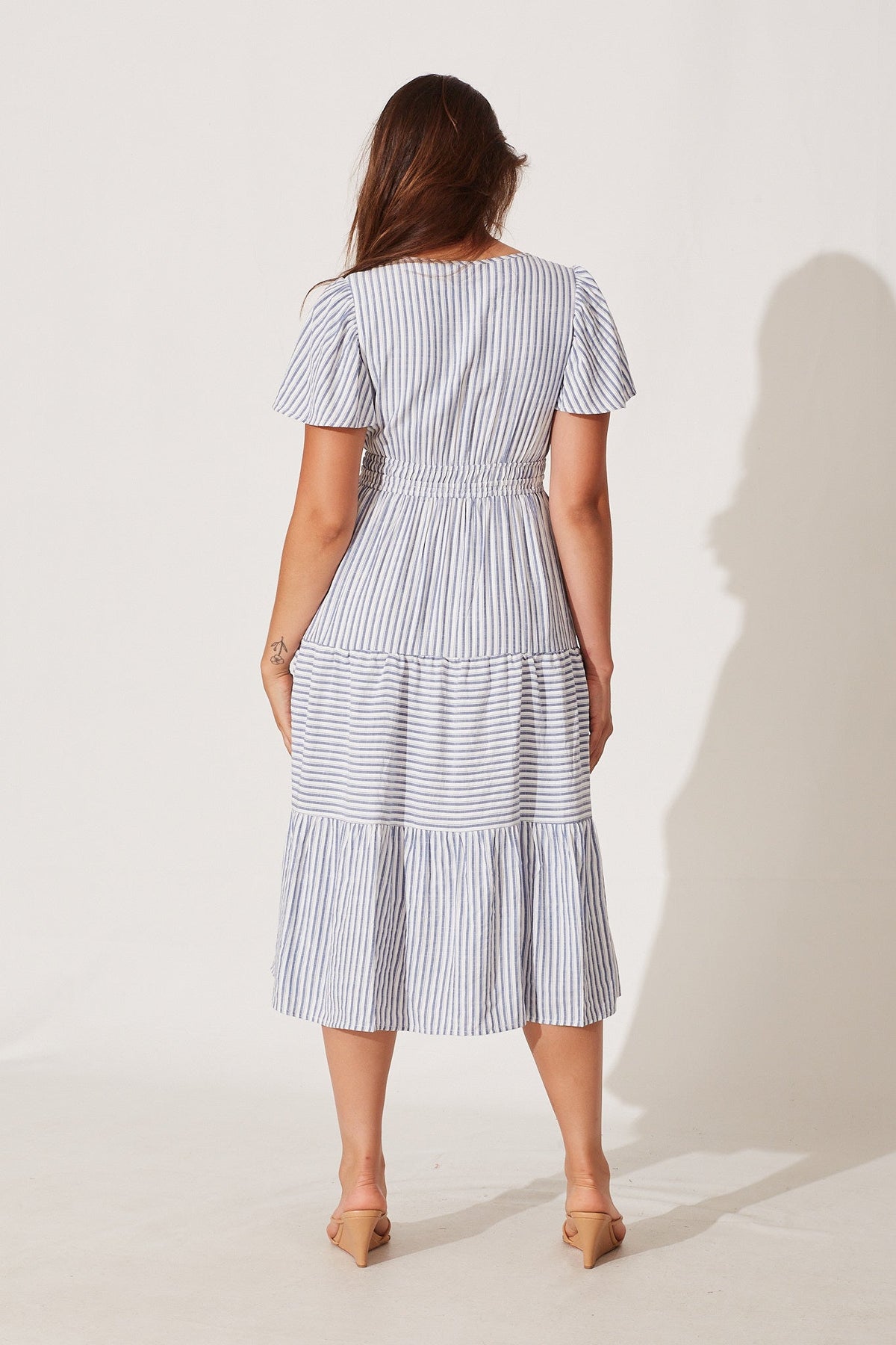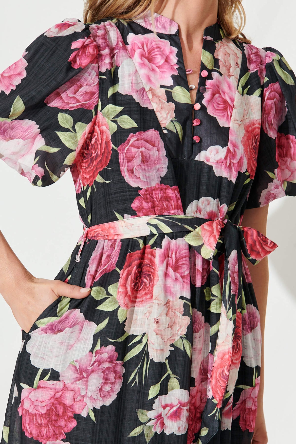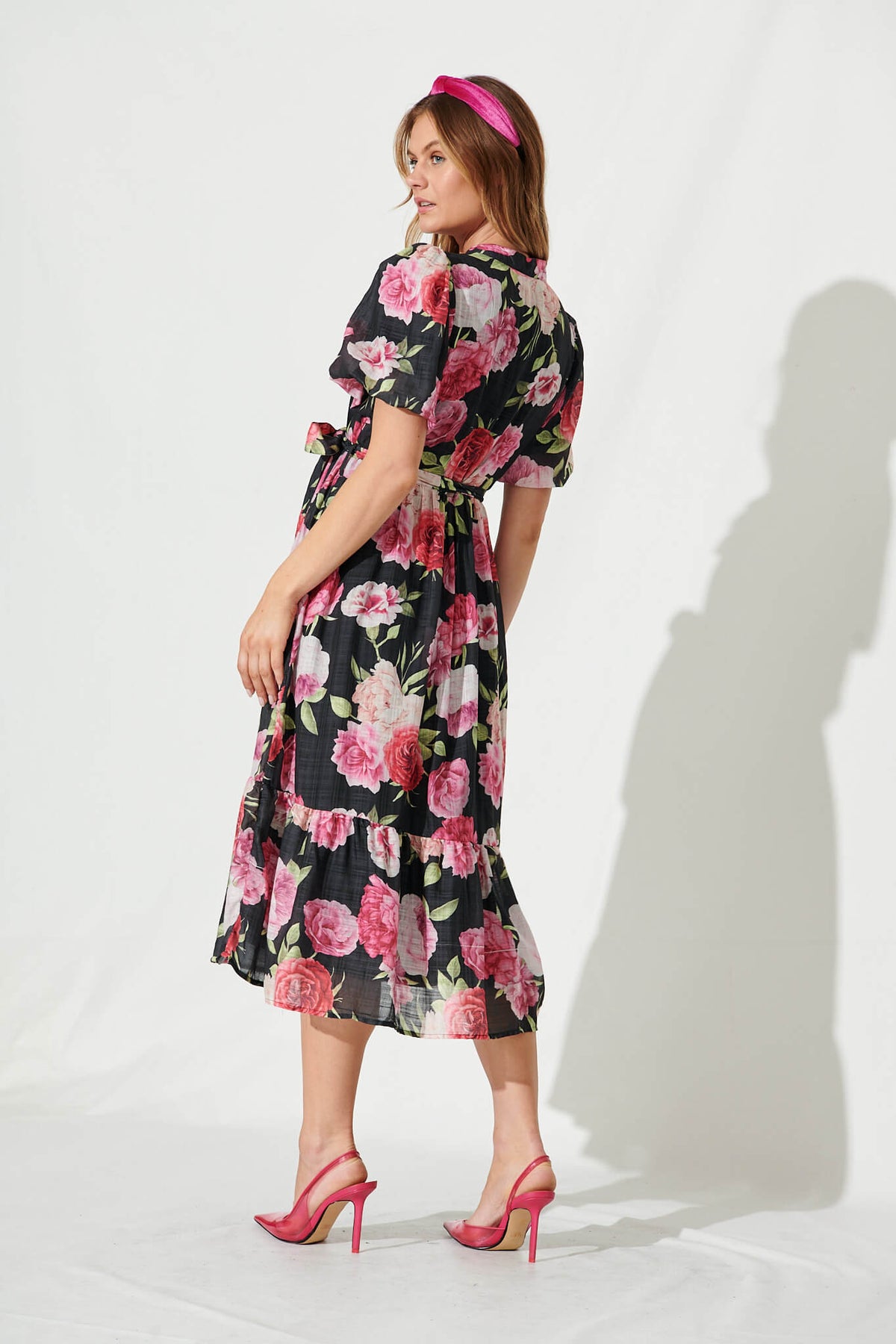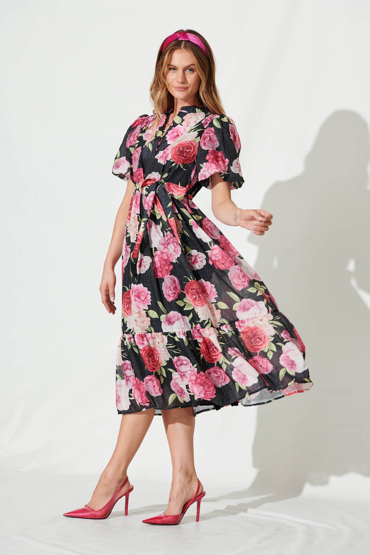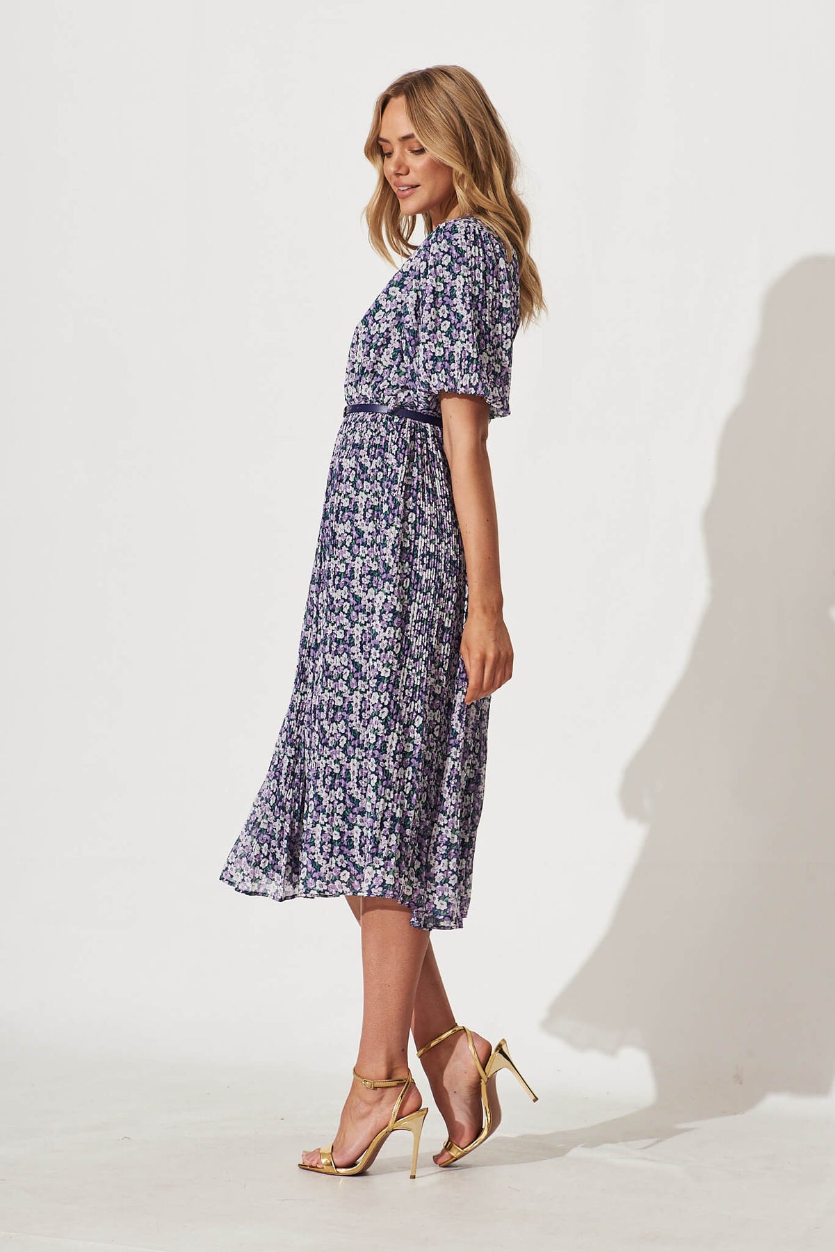 Rosalina Midi Dress With Belt In Multi Blue Floral