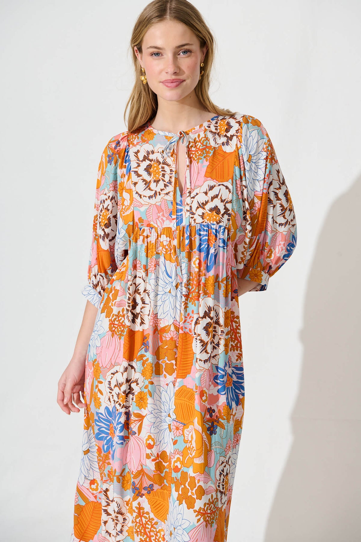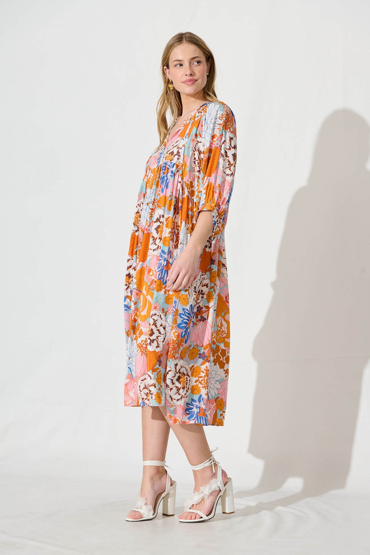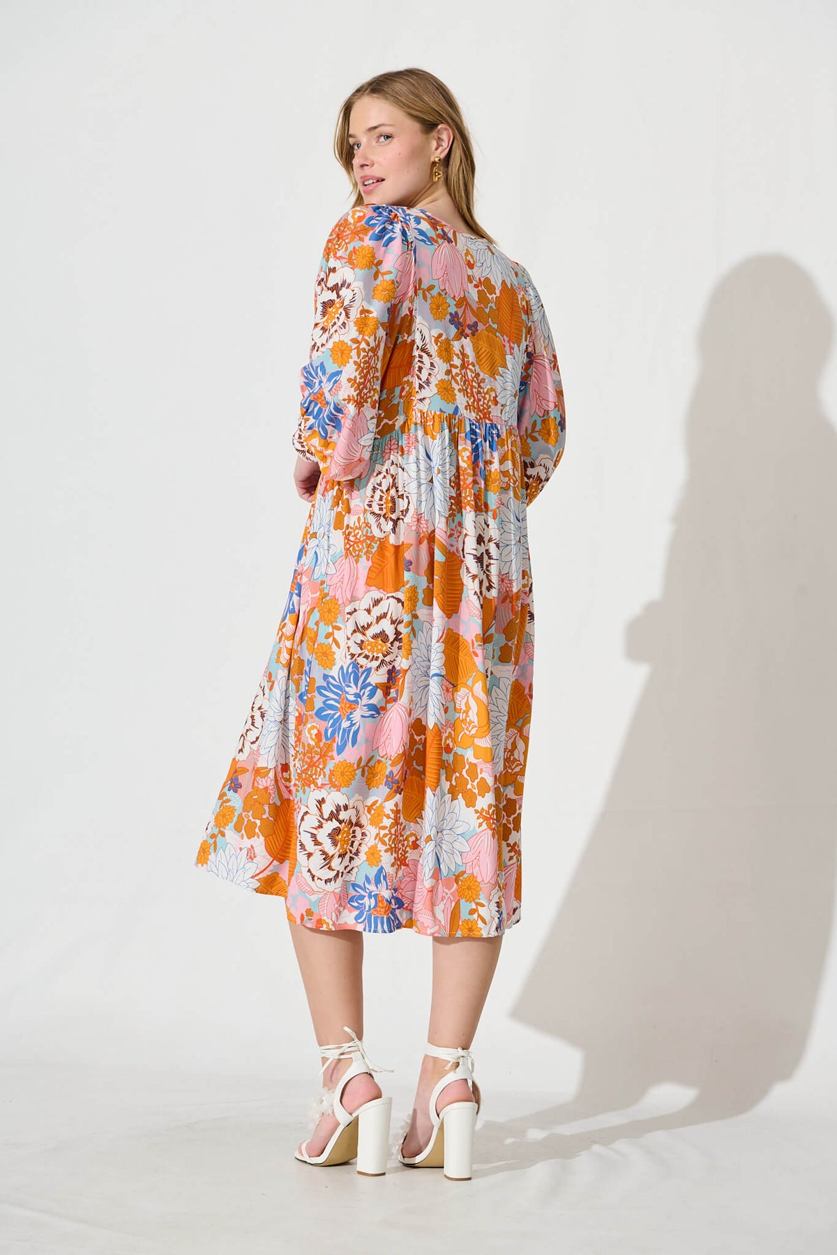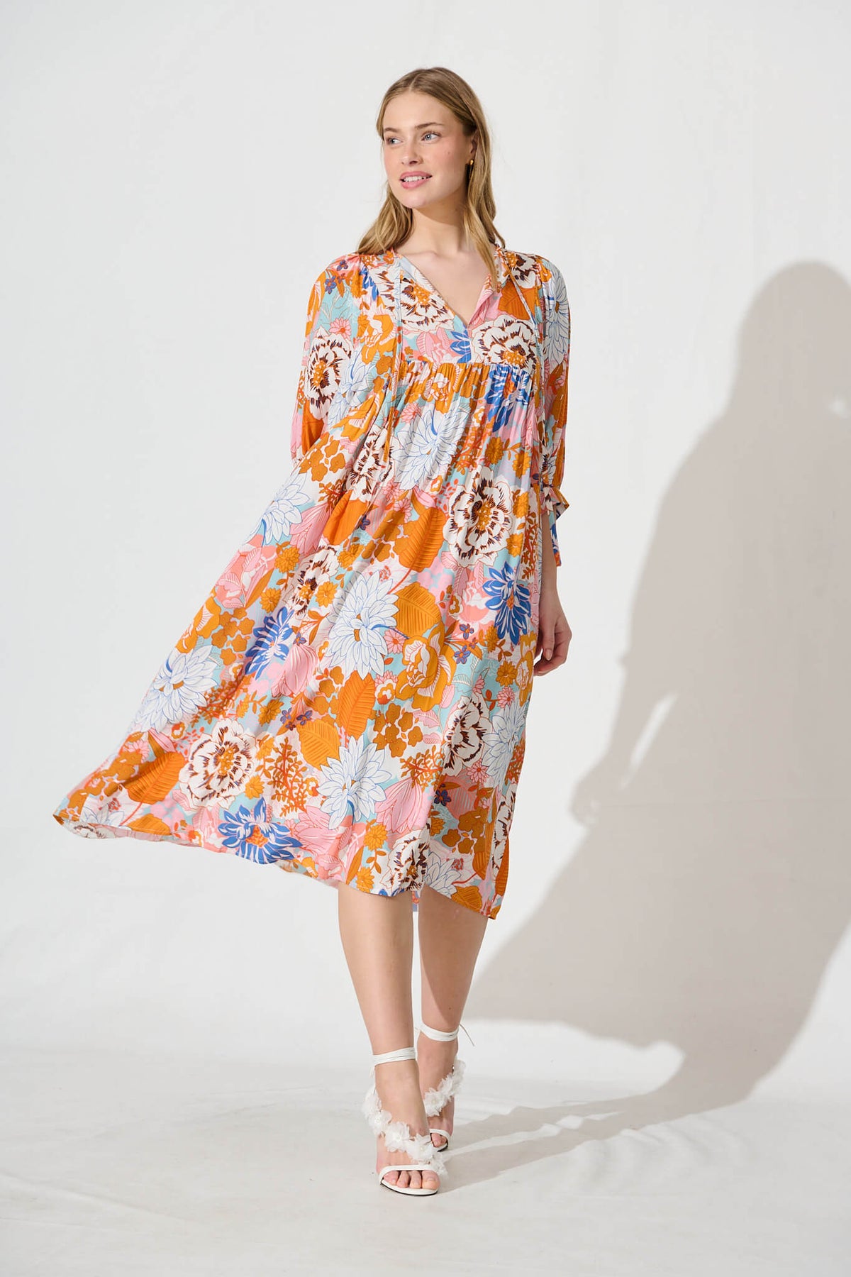 Spring Afternoon Midi Smock Dress In Orange Multi Floral