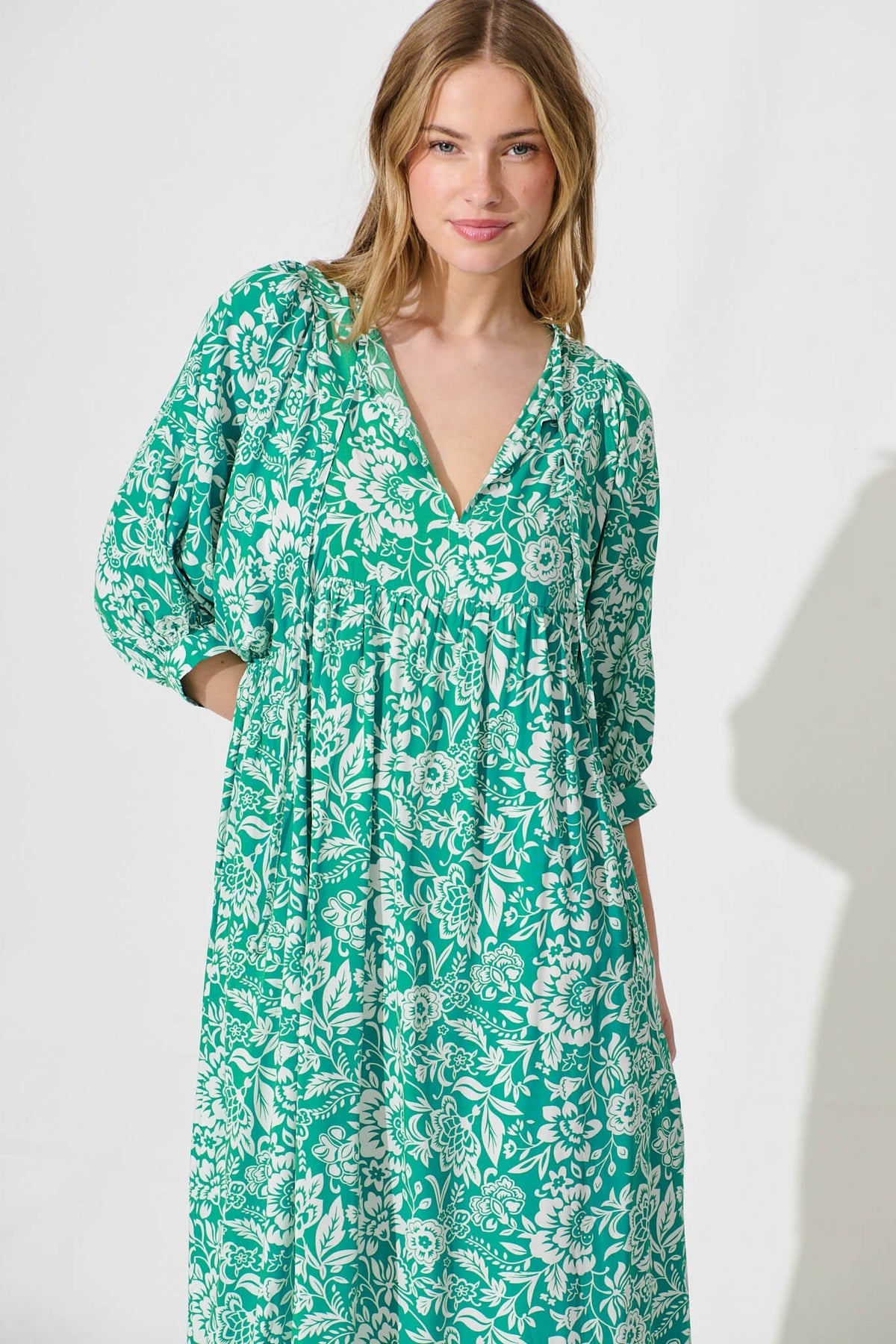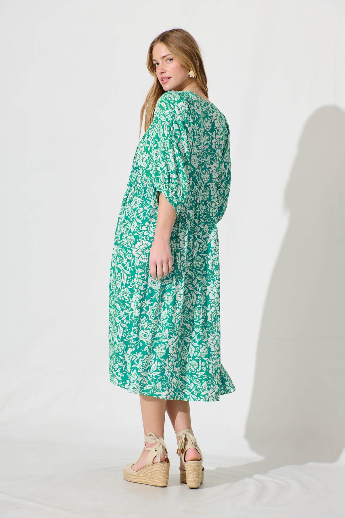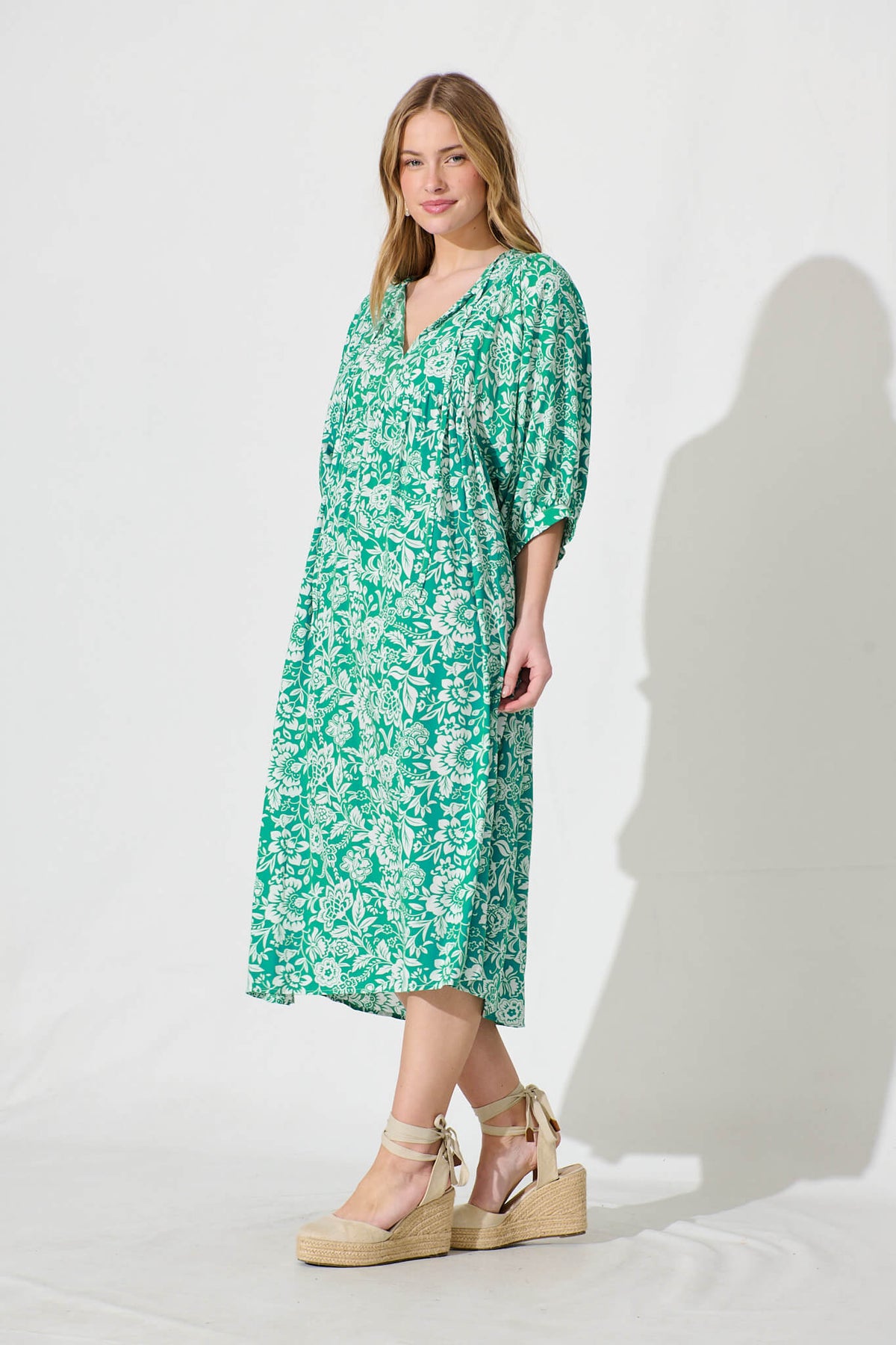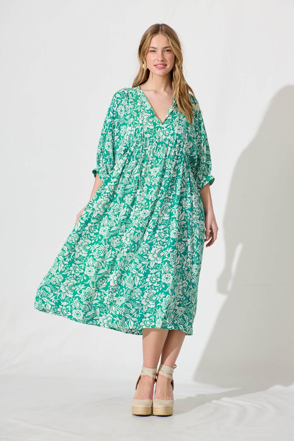 Spring Afternoon Midi Smock Dress In Green With White Print