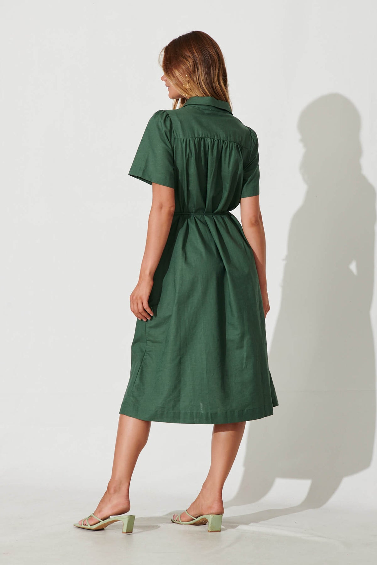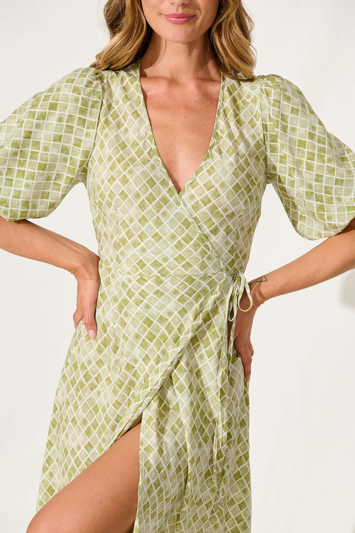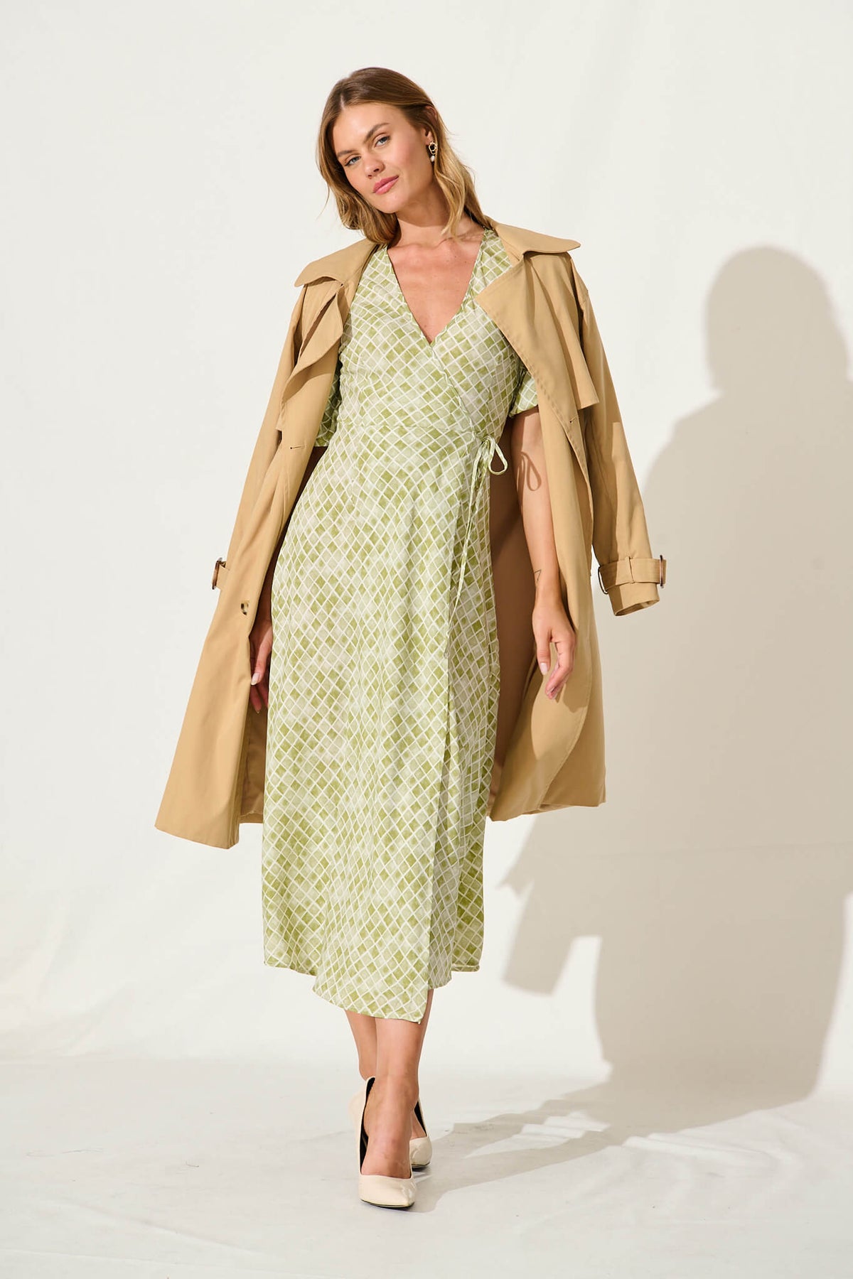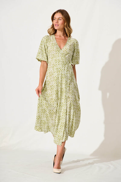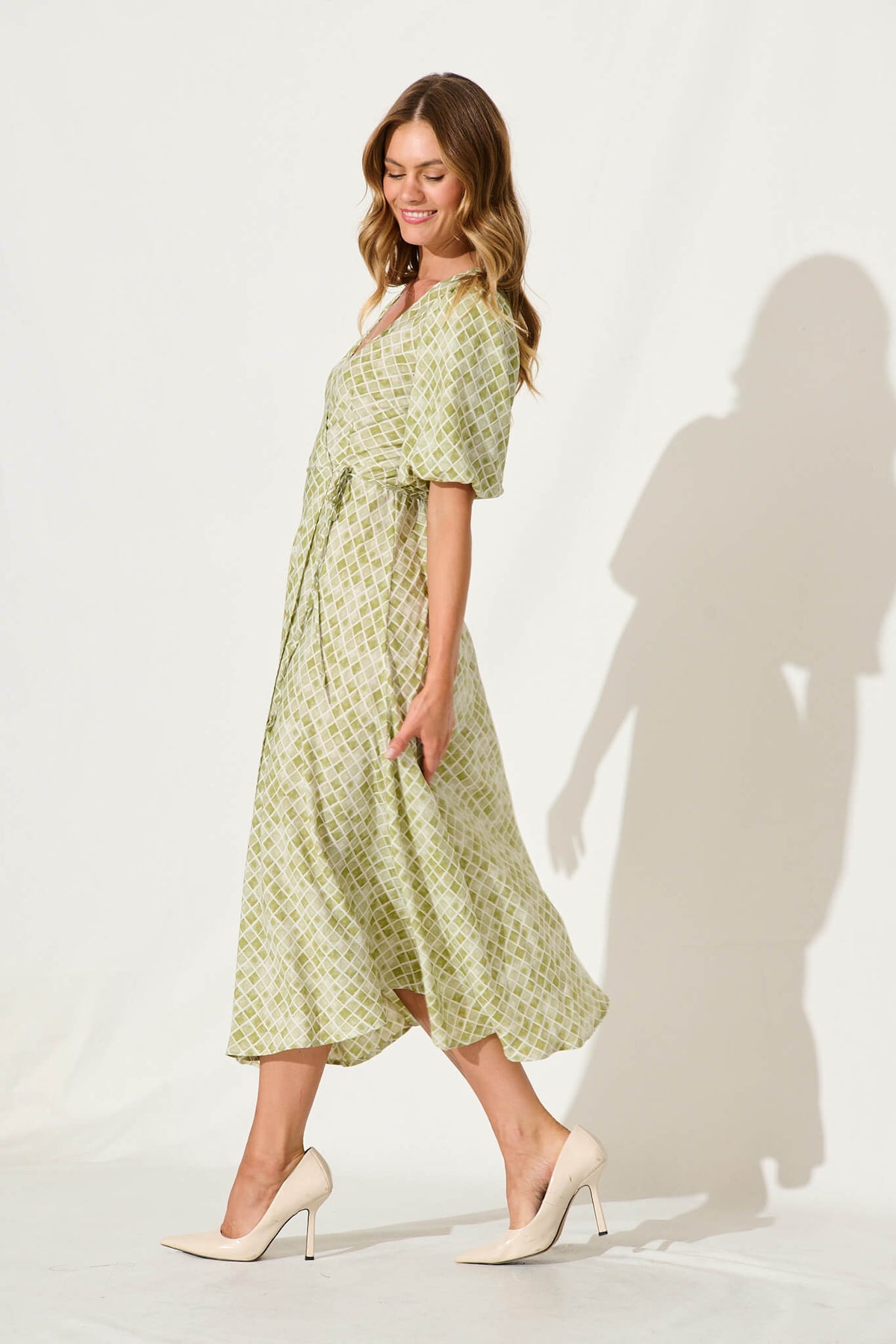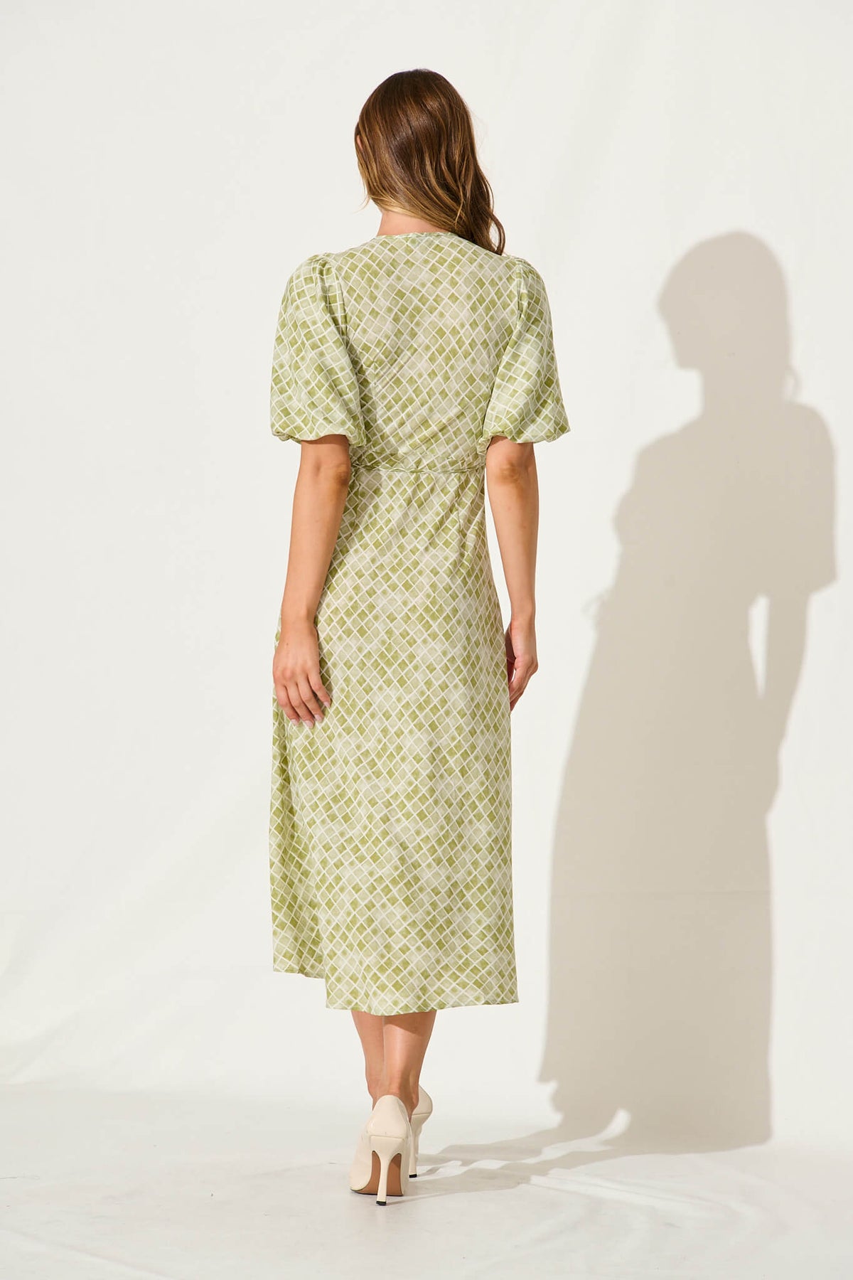 Spring Afternoon Midi Smock Dress In Green With White Print