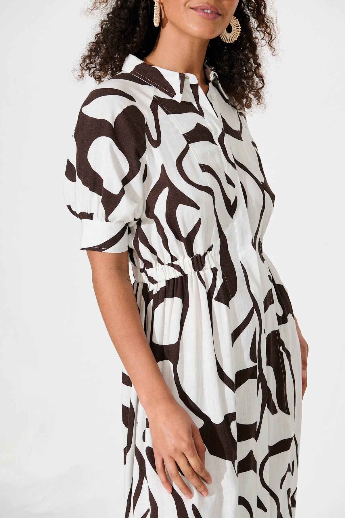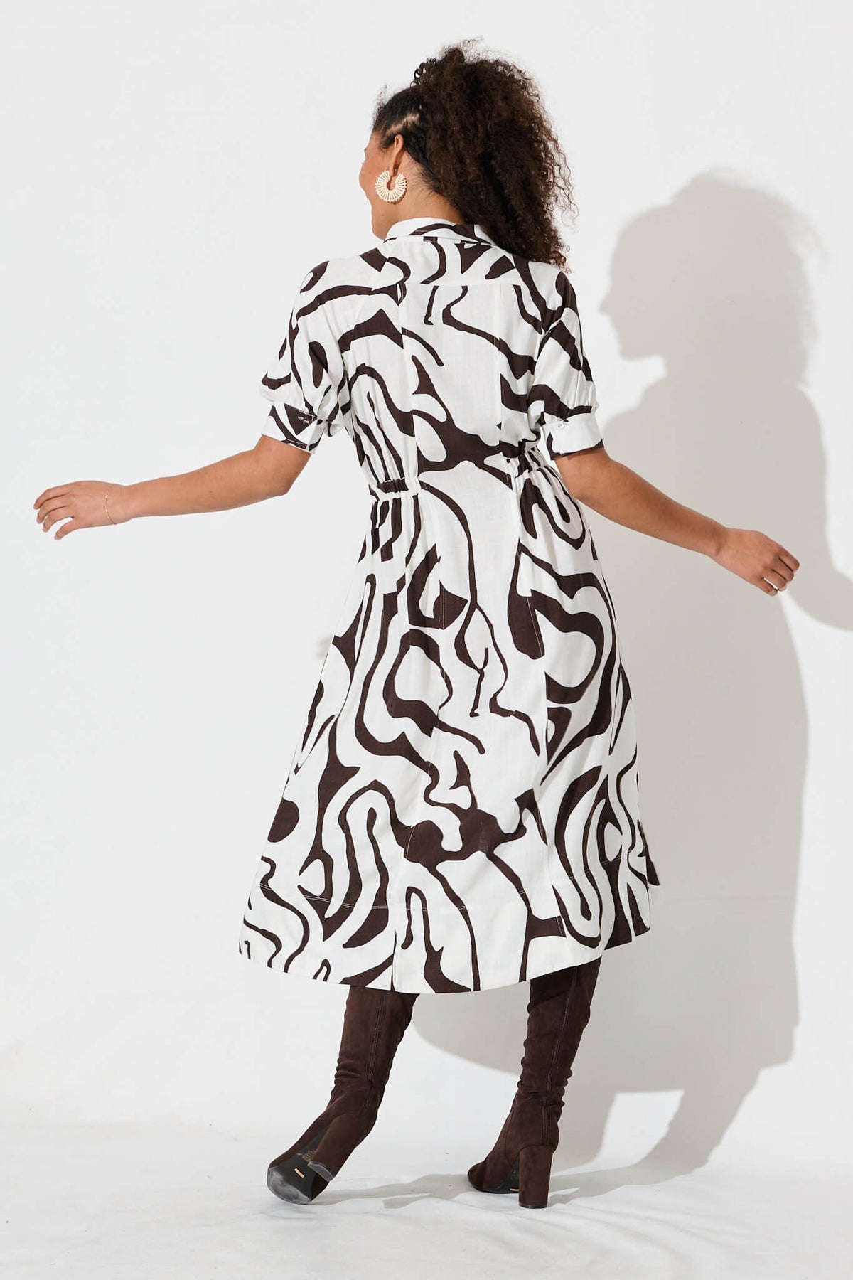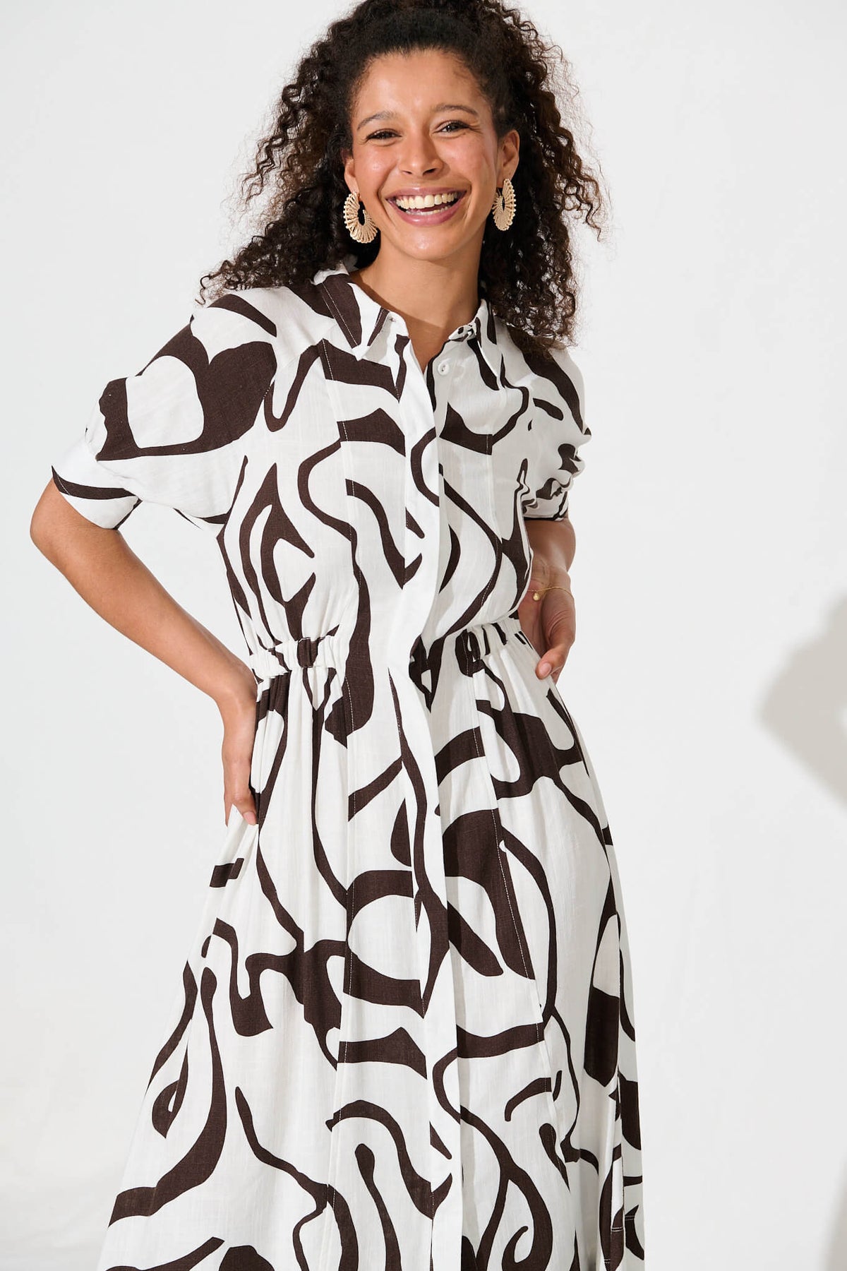 Sheraton Midi Shirt Dress In White With Chocolate Swirl Linen Blend