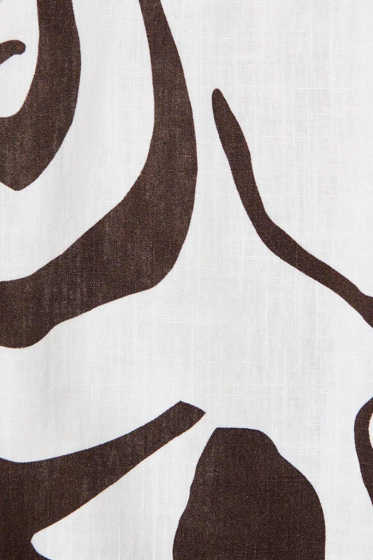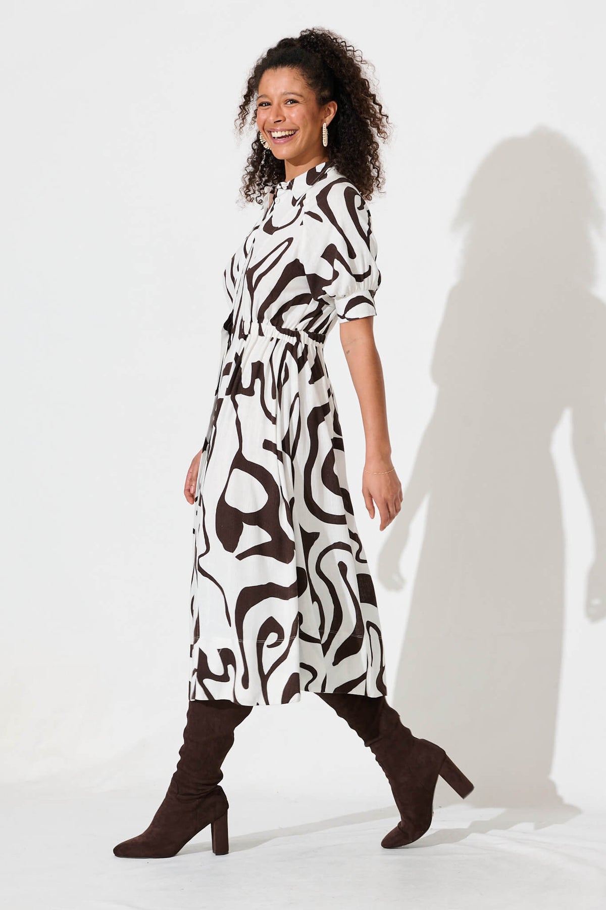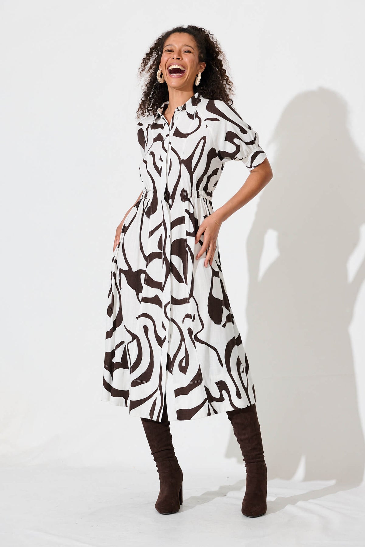 Sheraton Midi Shirt Dress In White With Chocolate Swirl Linen Blend