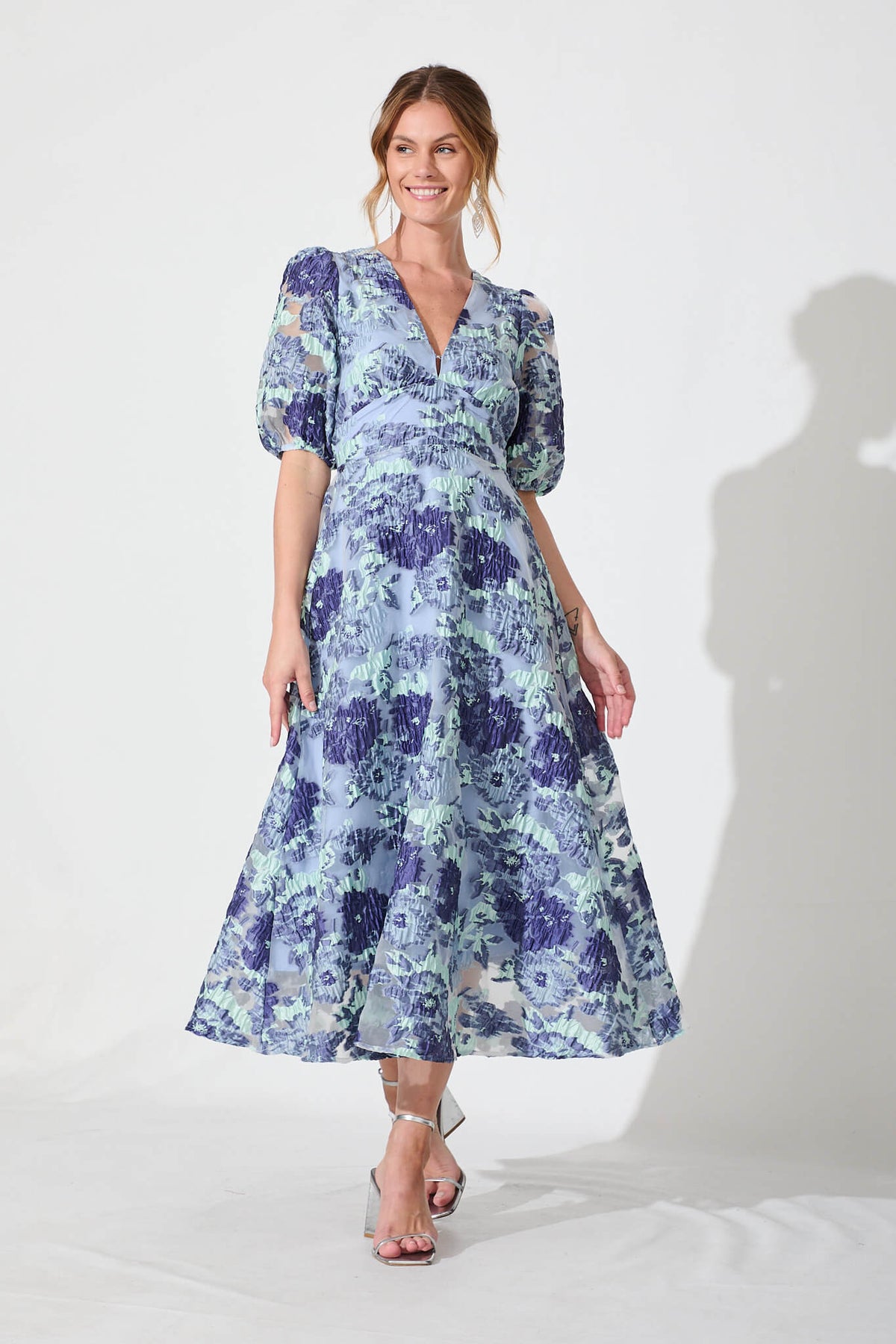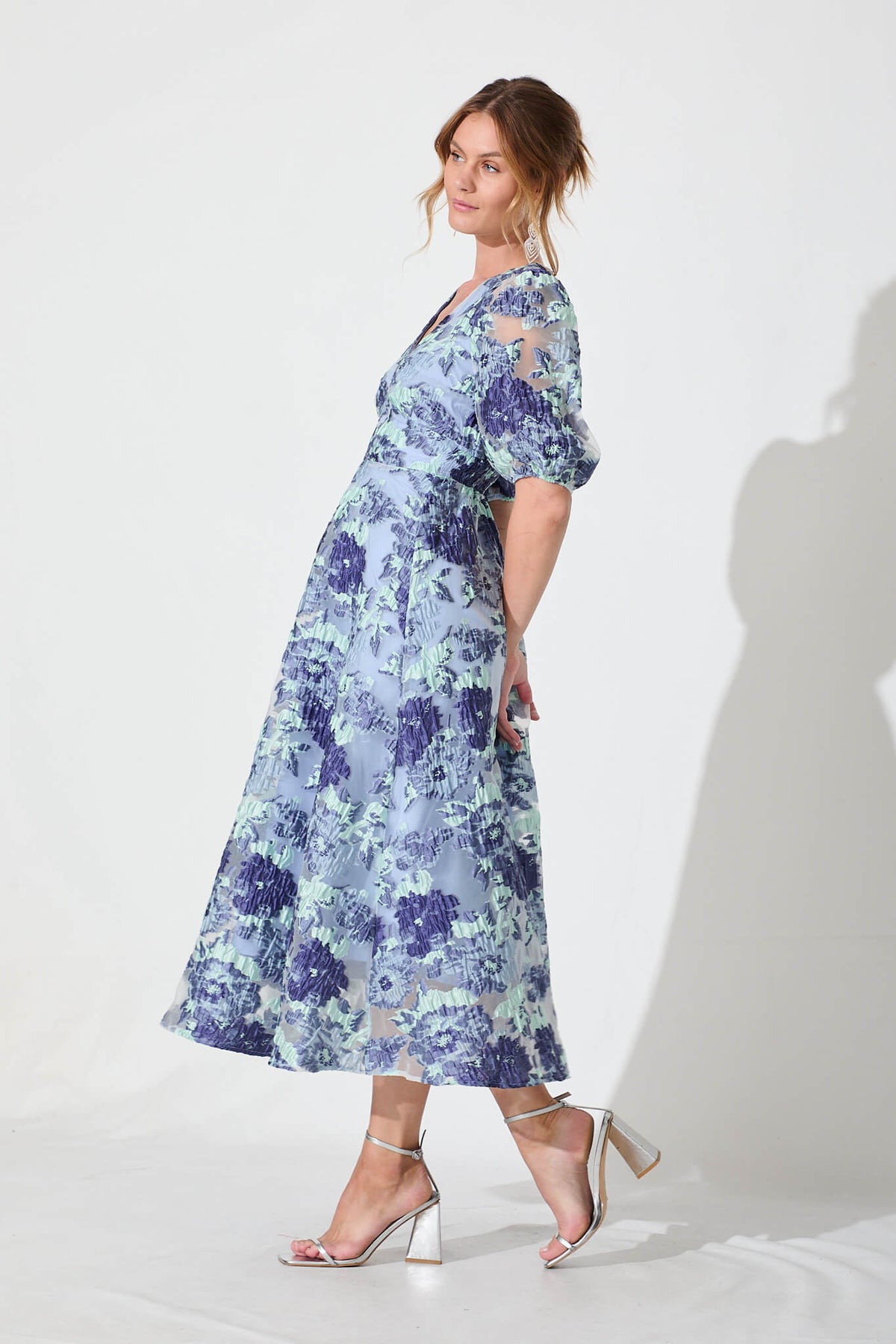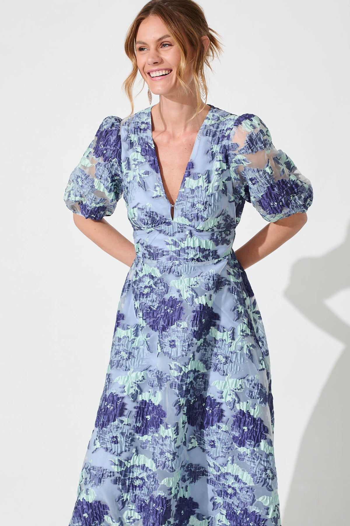 Opulence Midi Dress In Blue Floral Organza Jacquard