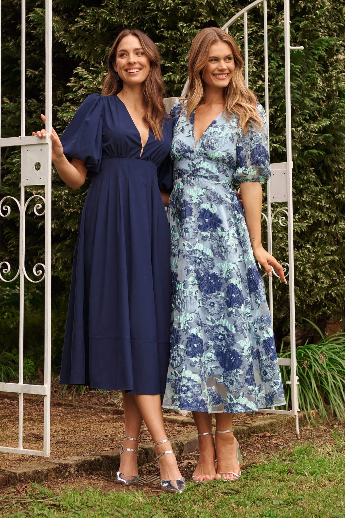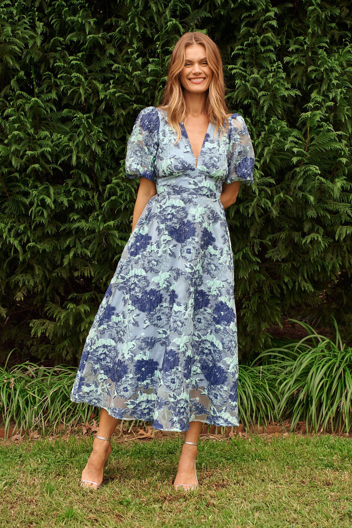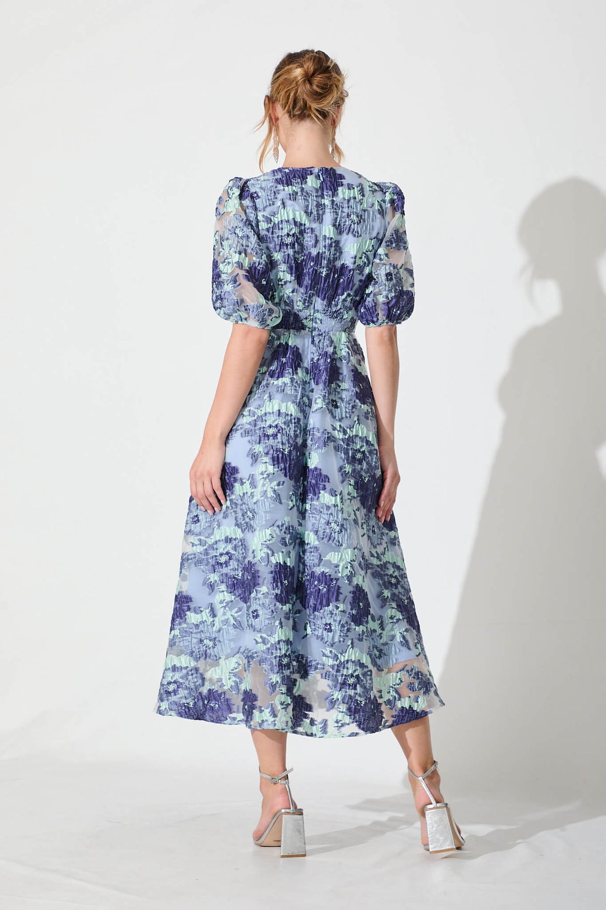 Opulence Midi Dress In Blue Floral Organza Jacquard