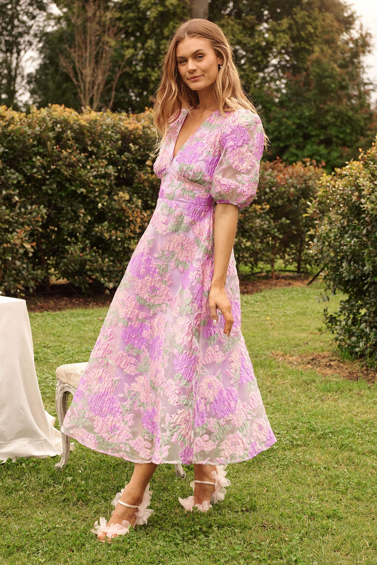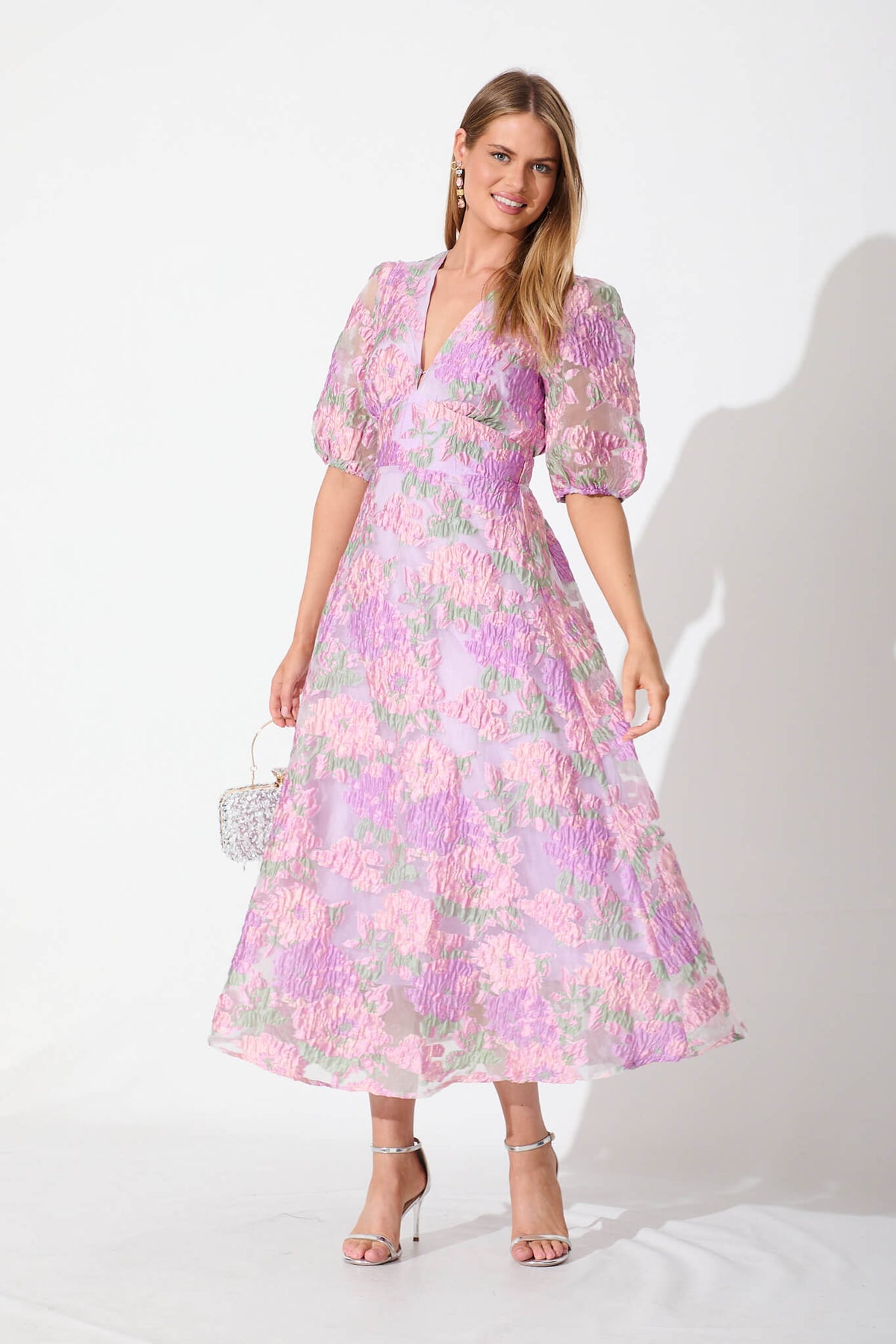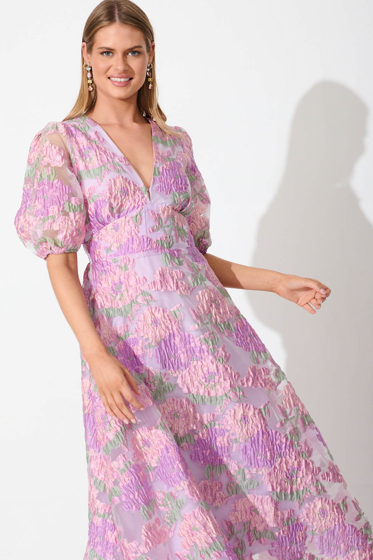 Opulence Midi Dress In Lilac Floral Organza Jacquard