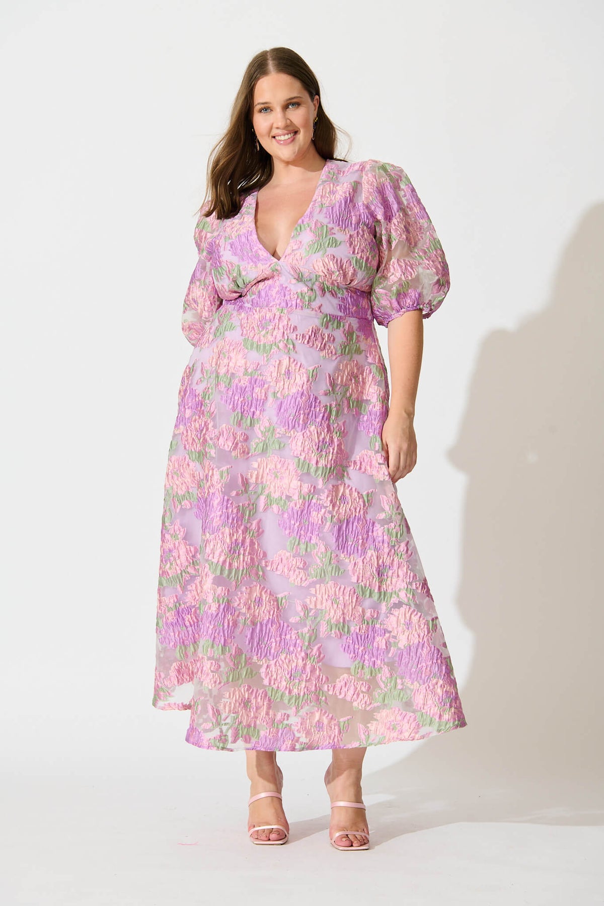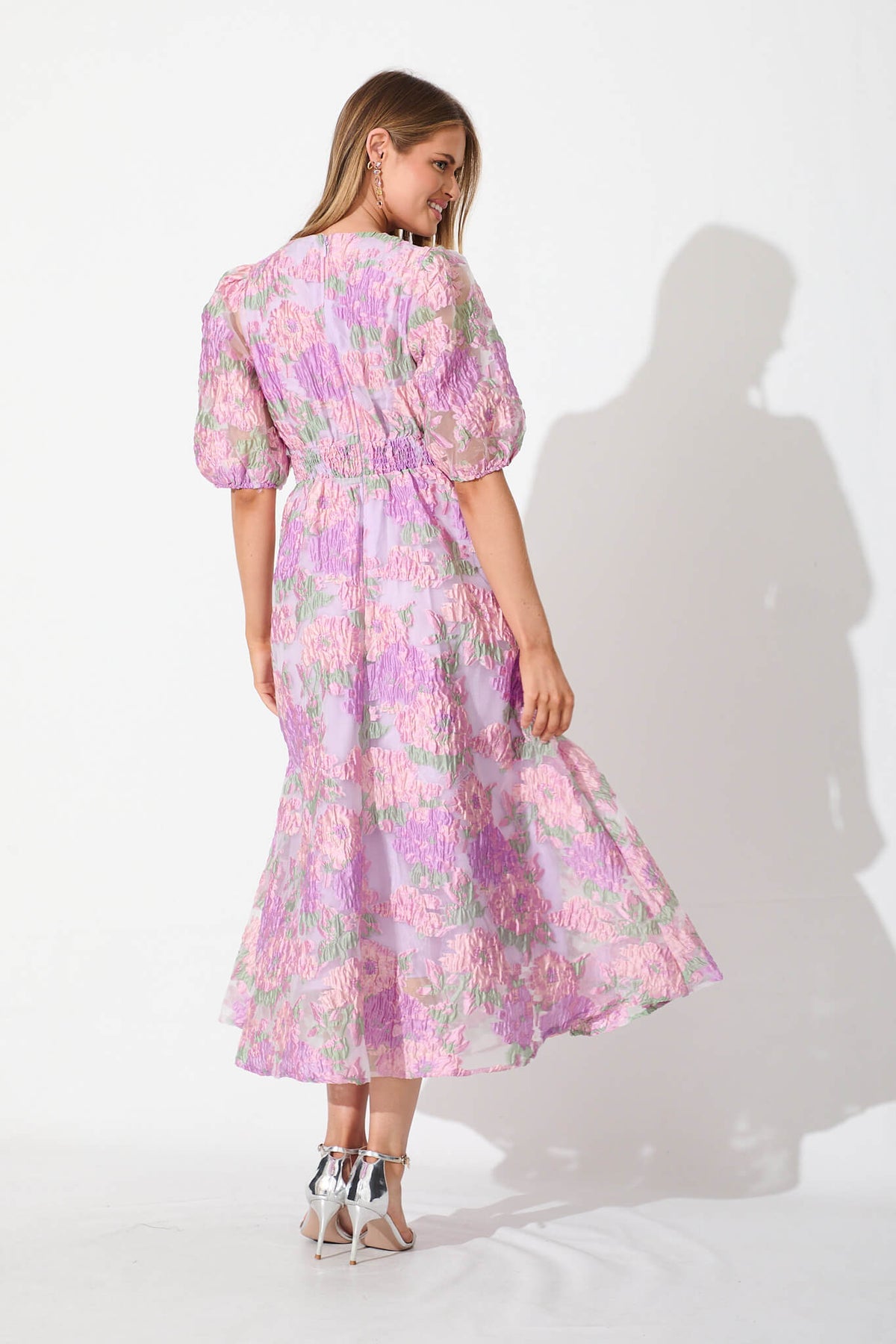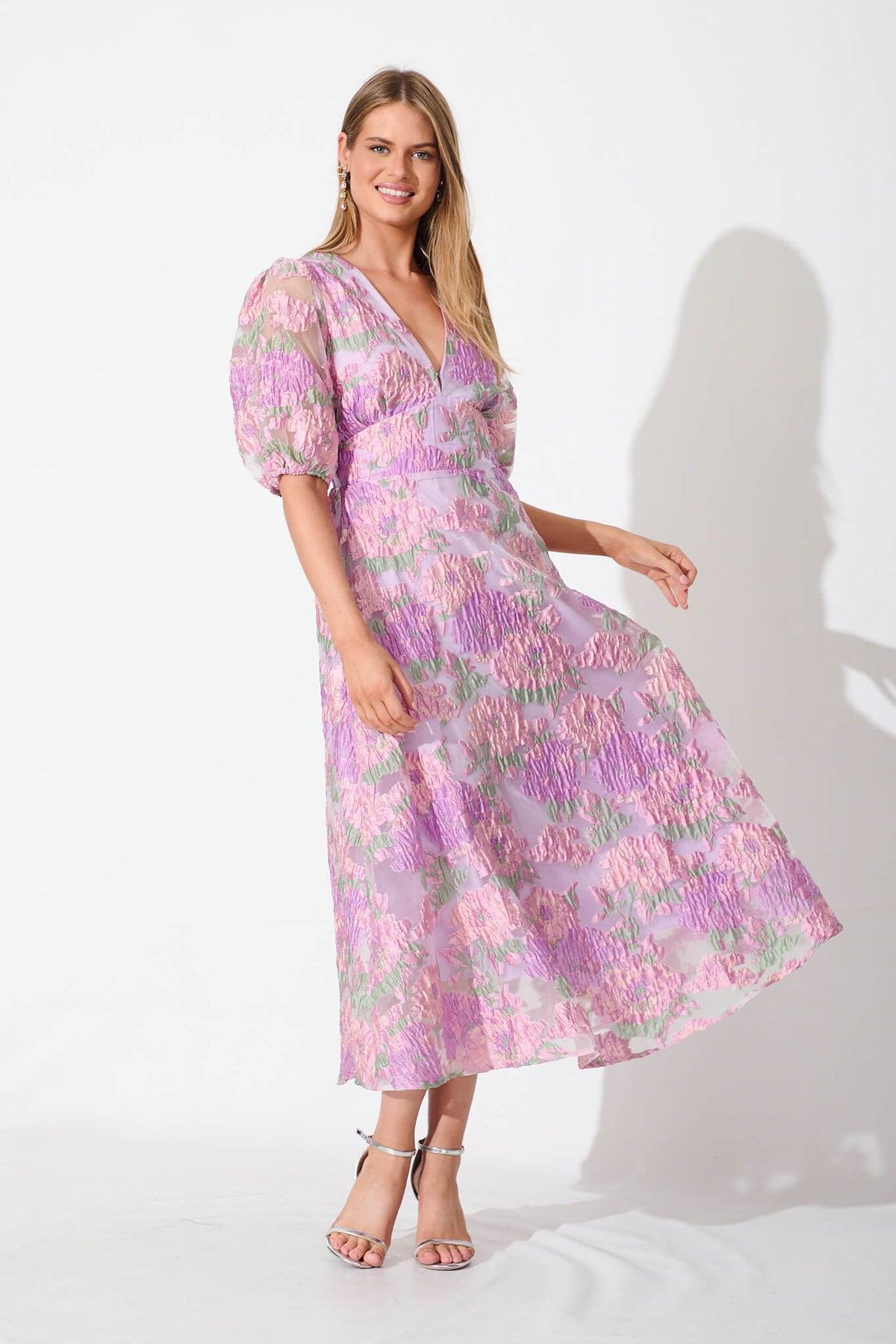 Opulence Midi Dress In Lilac Floral Organza Jacquard