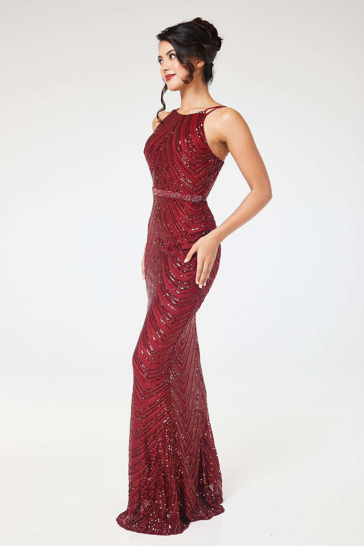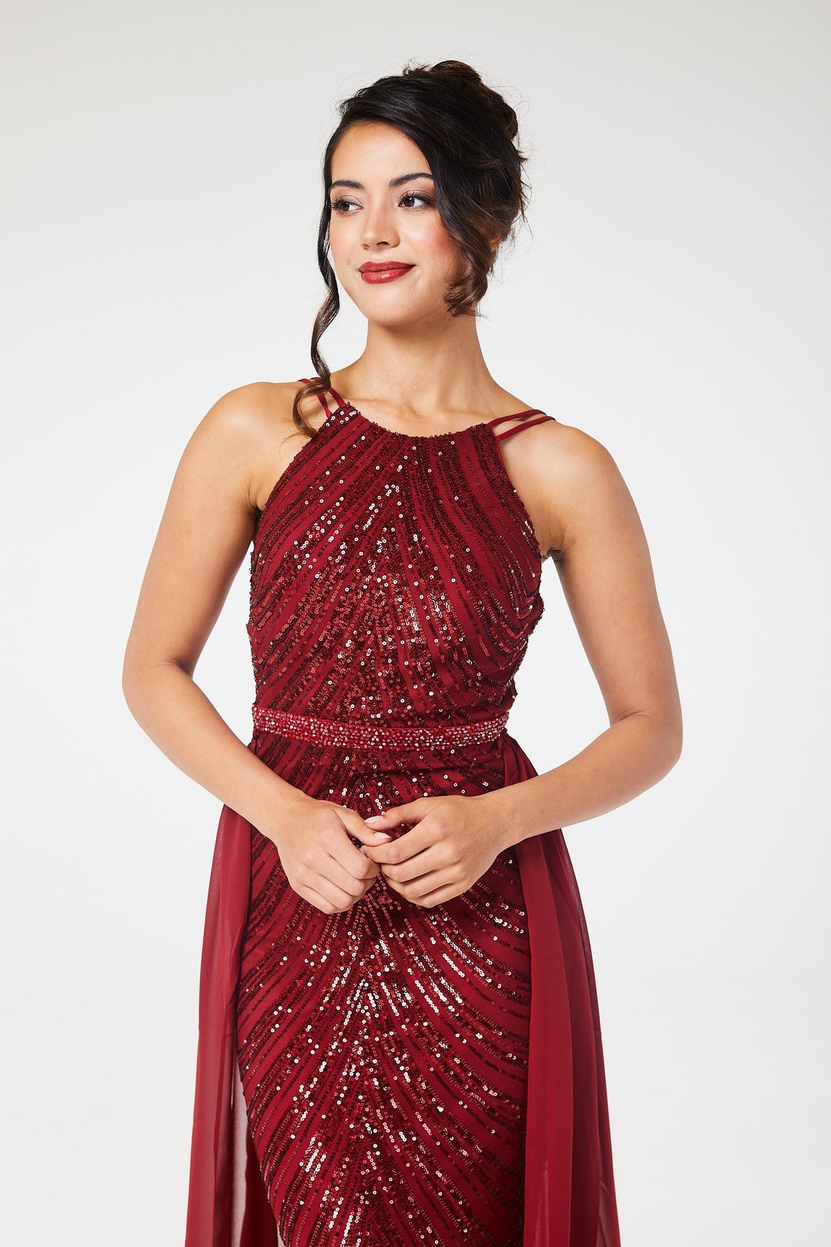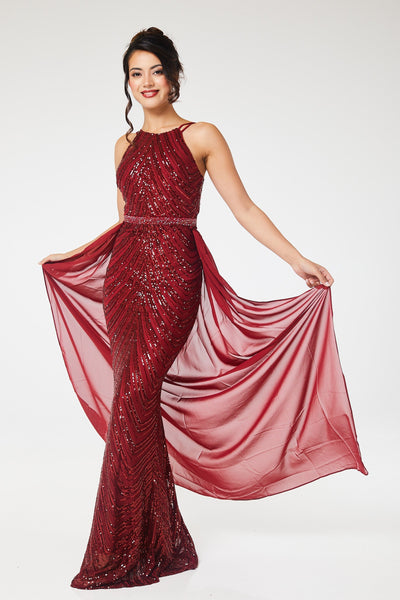 Wine Halterneck Sequin Maxi Dress with Detachable Skirt